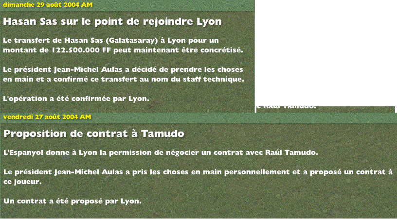 Posté(e) le 19 juillet 200520 a comment_84205 Je viens de commencer ma 1ere partie à FM et ilm'est arrivé un truc assez marrant (et chiant ) J'ai pris l'OL, premier mot d'Aulas : recruter. J'essaye, j'arrive pas a avoir les joueurs que je veux (en même temps je pensais pas qu'on ne pouvait pas avoir plus de 4 non UE dans l'effectif, moi qui etait content d'avoir Crespo à 50 MF...) Je passe donc jusqu'à fin aout sans recrue et je vois deux nouvelles : "proposition de contrat à Hasan Sas" "Proposition de contrat à Raul Tamudo" alors que je les avais pas contacté. C'est aulas qui s'en est occupé pour moi et qui les a fait signé. Seper, à 120 et 225 MF c'est génial, j'ai plus rien pour recruter :unsure: Démonstration sur le screenshot Signaler