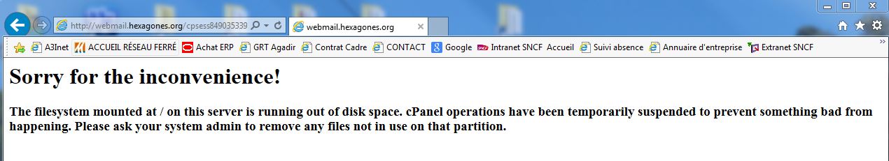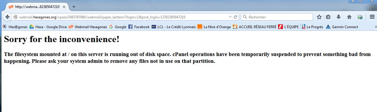 Posté(e) le 6 septembre 20169 a comment_317335 Salut, depuis hier j'ai régulièrement un message d'erreur quand je me connecte sur le forum ou sur la messagerie webmail (chez moi ou au boulot) : Sorry for the inconvenience! The filesystem mounted at / on this server is running out of disk space. cPanel operations have been temporarily suspended to prevent something bad from happening. Please ask your system admin to remove any files not in use on that partition. Signaler