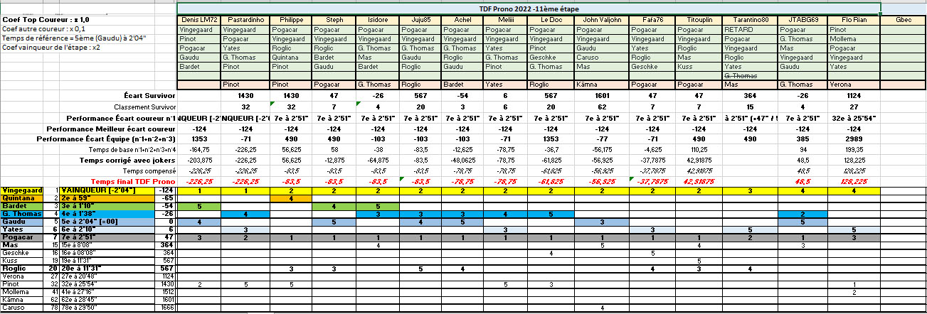 Posté(e) le 14 juillet 20223 a comment_345238 ------------------------------------- TDF PRONO 2022 ------------------------------------- 11ème étape mercredi 13 juillet Albertville - Col du Granon Serre Chevalier 151.7 km - Montagne Départ de l'étape : mercredi 13/07 à 12h15 ------------------------------------- Le duo Denis La Malice - Pastardinho triomphe au Granon et renverse le TDF Prono ! ------------------------------------- Classement de l'étape au temps ------------------------------------- 1. Denis LM72 2. Pastardinho à 00" 3. Philippe à 2'23" 4. Steph à 2'23" 5. Isidore à 2'23" 6. Juju85 à 2'23" 7. Achel à 2'28" 8. Meliii à 2'28" 9. Le Doc à 2'44" 10. John Valjohn à 2'49" 11. Fafa76 à 3'08" 12. Titouplin à 4'29" 13. Tarantino80 [en retard] à 4'35" 14. JTABG69 à 4'35" 15. Flo Rian à 5'54" 16. Gbec à 6'04" (temps de pénalité pour défaut de prono sur cette étape) ------------------------------------- Bonifications pour les 3 premiers de l'étape : Denis LM72 gagne 10", Pastardinho gagne 06", Philippe gagne 04" ------------------------------------- Classement par points - Étape ------------------------------------- ARRIVÉE 1. Philippe 30 pts 2. Titouplin 25 pts 3. Pastardinho 22 pts 4. Steph 20 pts 5. Achel 17 pts 6. Denis LM72 15 pts 7. Fafa76 13 pts 8. JTABG69 11 pts 9. Juju85 9 pts 10. Le Doc 7 pts 11. John Valjohn 6 pts 12. tarantino80 5 pts 13. Flo Rian 4 pts 14. Meliii 3 pts 15. Isidore 2 pts SPRINT INTERMÉDIAIRE (Geschke non classé, présent dans le groupe d'échappées) 1.Le Doc 10 pts 2.Fafa76 8.5 pts ------------------------------------ Classement Meilleur Grimpeur Étape ------------------------------------- (à suivre) ------------------------------------- Combativité ------------------------------------- (à suivre) ------------------------------------- Classements Performance TDF Prono ------------------------------------- Classement Performance de l'étape par 'équipe' (classement cumulé de vos trois coureurs n°1, n°2 et n°3) 1. ACHEL 2. ISID à 00" 3. JUJU à 00" 4. JOHN à 26" 5. FAFA à 32" 6. PASTA à 32" 7. MELI à 32" 8. JTABG à 8'08" 9. TITOU à 9'53" 10. PHIL à 9'53" 11. STEPH à 9'53" 12. TARANT à 9'53" 13. DLM à 24'16" 14. DOC à 24'16" 15. FLOR à 51'32" 16. BEC à 52'02" (temps de pénalité équipe pour défaut de prono sur cette étape) Classement Performance Coureur n°1 1. Denis LM72, Pastardinho (1er Vingegaard) 3. Fafa76, Achel, Le Doc, Titouplin, Isidore, Philippe, JTABG69, John Valjohn, Juju85, Meliii, Steph, Tarantino80 (Pogacar 7e à 2'51") 15. Flo Rian (Pinot 32e à 20'48"') Classement Performance Meilleur coureur joué Tout le monde avait retenu Vingegaard dans son prono Signaler