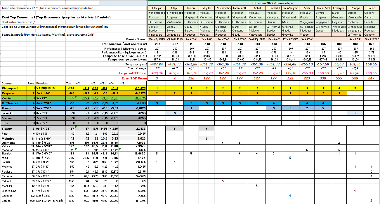 Posté(e) le 21 juillet 20223 a comment_345392 ------------------------------------- TDF PRONO 2022 ------------------------------------- Titouplin s'impose à Hautacam, Denis LM s'écroule, Steph prend le pouvoir ! ------------------------------------- 18ème étape jeudi 21 juillet Lourdes - Hautacam 143.2 km - Montagne ------------------------------------- ------------------------------------- Classement de l'étape au temps ------------------------------------- 1. Titouplin 2. Steph à 07" 3. Isidore à 2'06" 4. Juju85 à 2'07" 5. Pastardinho à 2'07" 6. Tarantino80 à 2'07" 7. Achel à 2'07" 8. JTABG69 à 2'07" 9. John Valjohn à 2'33" 10. Meliii à 3'43" 11. Denis LM72 à 5'30" 12. Lovergnat à 9'15" 13. Philippe à 9'49" 14. Fafa76 à 10'47" 15. Flo Rian, Gbec, Le Doc à 10'57" (temps de pénalité pour défaut de prono sur cette étape) ------------------------------------- Bonifications pour les 3 premiers de l'étape : Titouplin gagne 10", Steph gagne 06", Isidore gagne 04" ------------------------------------- Classement par points - Étape ------------------------------------- ARRIVÉE 1. Titouplin 20 pts 2. Steph 17 pts 3. Isidore 15 pts 4. Juju85 13 pts 5. Pastardinho 11 pts 6. Tarantino80 10 pts 7. Achel 9 pts 8. JTABG69 8 pts 9. John Valjohn 7 pts 10. Meliii 6 pts 11. Denis LM72 5 pts 12. Lovergnat 4 pts 13. Philippe 3 pts --- aucun coureur classé dans le Top15 --- 14. Fafa76 1 pt SPRINT INTERMÉDIAIRE (Ciccone 8e > Leknessund, Madouas échappés > Peloton groupé) 1.Fafa76 20 pts, puis Philippe 8.5 pts, Meliii 7.5 pts, Lovergnat 6.5 pts ------------------------------------ Classement Meilleur Grimpeur Étape ------------------------------------- Km 76,7 – Hors-cat. : Col d’Aubisque (Ciccone 1er > Madouas 4e > Mas 8e > Leknessund, Lutsenko, Schultz et Mollema 1er groupe échappés) 1.Fafa76 20 pts 2.Meliii 15 pts 3.Lovergnat 12 pts 4.John Valjohn 10 pts, puis Philippe 4 pts, Steph 3 pts, Denis LM72 2 pts, Titouplin 1 pt Km 110,0 – 1re cat. : Col de Spandelle (Lutsenko 4e > Madouas 6e > Pogacar - Vingegaard > Meintjes - Thomas) 1.Philippe 10 pts 2.Steph 8 pts 3.Meliii 6 pts 4.Lovergnat 4 pts puis Juju85 1 pt, Isidore 0.5 pt Arrivée Km 143,2 – Hors-cat. : Hautacam (Classement étape) 1.Titouplin 20 pts 2.Steph 15 pts 3.Isidore 12 pts 4.Juju85 10 pts 5.Pastardinho 8 pts 6.Tarantino80 6 pts 7.Achel 4 pts 8.JTABG69 2 pts ------------------------------------- Combativité ------------------------------------- Geschke : John Valjohn 1 pt Lutsenko : Philippe 3 pts, Steph 2 pts Leknessund : Philippe 1 pt Madouas : Meliii, Lovergnat 1 pt Mollema : Philippe 2 pts, Fafa76 1 pt Powless : Fafa76 1 pt Ciccone : Fafa76 2 pts Mas : John Valjohn 1 pt Schultz : Denis LM72 2 pts, Fafa76, Titouplin 1 pt Meintjes : Juju85 2 pts McNulty : Achel 1 pt Pogacar : Achel, Isidore, Meliii, John Valjohn, JTABG69, Pastardinho, Tarantino80, Juju85 3 pts ; Denis LM72, Steph, Titouplin 2 pts ; Lovergnat 1 pt G.Thomas : Achel, Isidore, Pastardinho, Tarantino80, Titouplin, Juju85 1 pt Gaudu : Meliii, JTABG69 1 pt Vingegaard : Steph, Titouplin 1 pt ------------------------------------- Classements Performance TDF Prono 18ème étape ------------------------------------- Classement Performance de l'étape par 'équipe' (classement cumulé de vos trois coureurs n°1, n°2 et n°3) 1. TITOU 2. ISID à 00" 3. ACHEL à 00" 4. PASTA à 00" 5. TARANT à 00" 6. JUJU à 00" 7. JTABG à 04" 8. MELI à 04" 9. STEPH à 15" 10. JOHN à 4'29" 11. DLM à 8'18" 12. LOVERGN à 9'08" 13. PHIL à 20'08" 14. FAFA à 59'22" Classement Performance Coureur n°1 1. Steph, Titouplin (Vingegaard 1er) -10" bonifications 3. Achel, Isidore, Meliii, John Valjohn, JTABG69, Pastardinho, Tarantino80, Juju85 (2e Pogacar à 1'04'') -06" bonifications 11. Philippe, Lovergnat (17e Bardet à 6'40'') 12. Denis LM72 (25e Schultz à 11'12'') 13. Fafa76 (38e Ciccone à 18'02'') Classement Performance Meilleur coureur joué Tout le monde avait inclus Vingegaard dans son prono, sauf Fafa76 (Schultz 25e à 11'12") Modifié le 21 juillet 20223 a par Titouplin Signaler