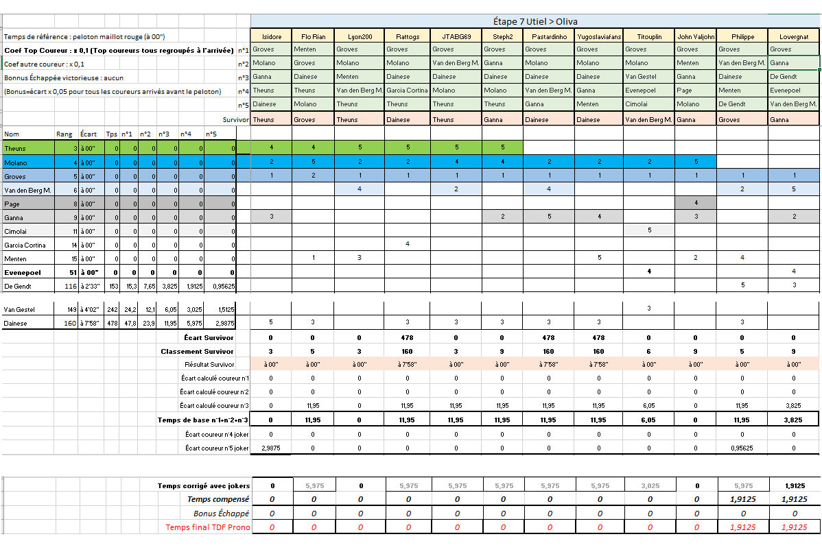 Posté(e) le 1 septembre 20232 a Auteur comment_348485 ------------------------------------- RÉSULTATS VUELTA PRONO 2023 - Étape 7 ------------------------------------- Étape 7 Utiel > Oliva 201 km - Plat ------------------------------------- Calme plat aujourd'hui, tout s'est joué dans les derniers kilomètres mais le final chaotique a surpris quelques-uns des favoris et ce sont les outsiders qui se sont imposés. Isidore remporte au sprint sa 1ère victoire d'étape en battant sur la ligne Flo Rian. Lyon200 assure la 3ème place et grappille quelques secondes de bonifications, mais reste 2ème du Classement Général, à 1'14" d leader Pastardinho. ------------------------------------- Classement de l'étape au temps ------------------------------------- 1. Isidore 2. Flo Rian à 00" 3. Lyon200 à 00" 4. Rattogs à 00" 5. JTABG69 à 00" 6. Steph2 à 00" 7. Pastardinho à 00" 8. Yugoslaviafans à 00" 9. Titouplin à 00" 10. John Valjohn à 00" 11. Philippe à 02" 12. Lovergnat et le reste du peloton à 02" ------------------------------------- Bonifications pour les 3 premiers de l'étape : Isidore gagne 10", Flo Rian gagne 06", Lyon200 gagne 04" ------------------------------------- Point Bonus : (voir sprint intermédiaire) Philippe gagne 06", JTABG69 gagne 04", Lyon200 gagne 02" ------------------------------------- Classement Général Individuel - MAILLOT ROUGE à l'issue de l'étape 7 ------------------------------------- 1. Pastardinho 2. Lyon200 à 1'14" 3. John Valjohn à 1'51" 4. Lovergnat à 1'57" 5. JTABG69 à 1'58" 6. Steph2 à 1'59" 7. Titouplin à 2'09" 8. Philippe à 2'13" 9. Rattogs à 2'14" 10. Isidore à 2'16" 11. Flo Rian à 2'19" 12. Yugoslaviafans à 3'00" ------------------------------------- Classement par points - Étape ------------------------------------- ------------------------------------- Arrivée ------------------------------------- 1. Isidore 50 pts 2. Flo Rian 30 pts 3. Lyon200 20 pts 4. Rattogs 18 pts 5. JTABG69 16 pts 6. Steph2 14 pts 7. Pastardinho 12 pts 8. Yugoslaviafans 10 pts 9. Titouplin 8 pts 10. John Valjohn 7 pts 11. Philippe 6 pts 12. Lovergnat 5 pts ------------------------------------- Sprint Intermédiaire ------------------------------------- 1. Philippe (1.Groves, joué n°1 + 2.Van den Berg n°2) 20 pts 2. JTABG69 (idem) 17 pts 3. Lyon200 (1.Groves, joué n°1 + 2.Van den Berg n°4) 15 pts 4. Pastardinho (idem) 13 pts 5. Lovergnat (1.Groves, joué n°1 + 2.Van den Berg n°5) 10 pts ------------------------------------- Classement Général par points - MAILLOT VERT à l'issue de l'étape 7 ------------------------------------- 1. JTABG69 179 pts 2. lyon200 142 pts 3. Pastardinho 127 pts 4. Lovergnat 124 pts 5. Steph2 123 pts 6. Yugoslaviafans 121 pts 7. Philippe 109 pts 8. Titouplin 103 pts 9. Isidore 100 pts 10. Rattogs 92 pts 11. John Valjohn 83 pts 12. Flo Rian 64 pts ------------------------------------ Classement Grimpeur Étape ------------------------------------- pas de côte répertoriée aujourd'hui ------------------------------------- Classement Général Meilleur Grimpeur - MAILLOT À POIS à l'issue de l'étape 7 ------------------------------------- 1. Pastardinho 18 pts 2. Steph2 13 pts 3. lyon200 12 pts 4. Rattogs 11 pts 5. John Valjohn 8 pts 6. Titouplin 6 pts 7. Lovergnat 6 pts 8. JTABG69 4 pts 9. Philippe 4 pts 10. Flo Rian 2 pts 11. Isidore 2 pts 12. Yugoslaviafans 1 pt Signaler