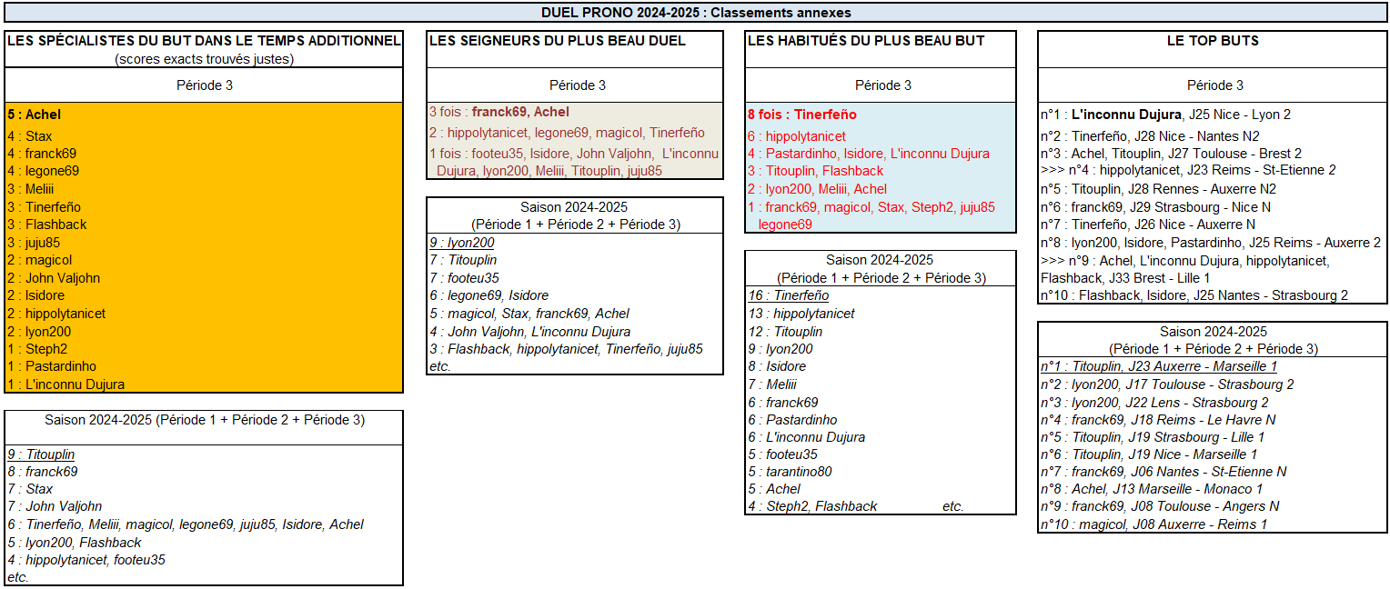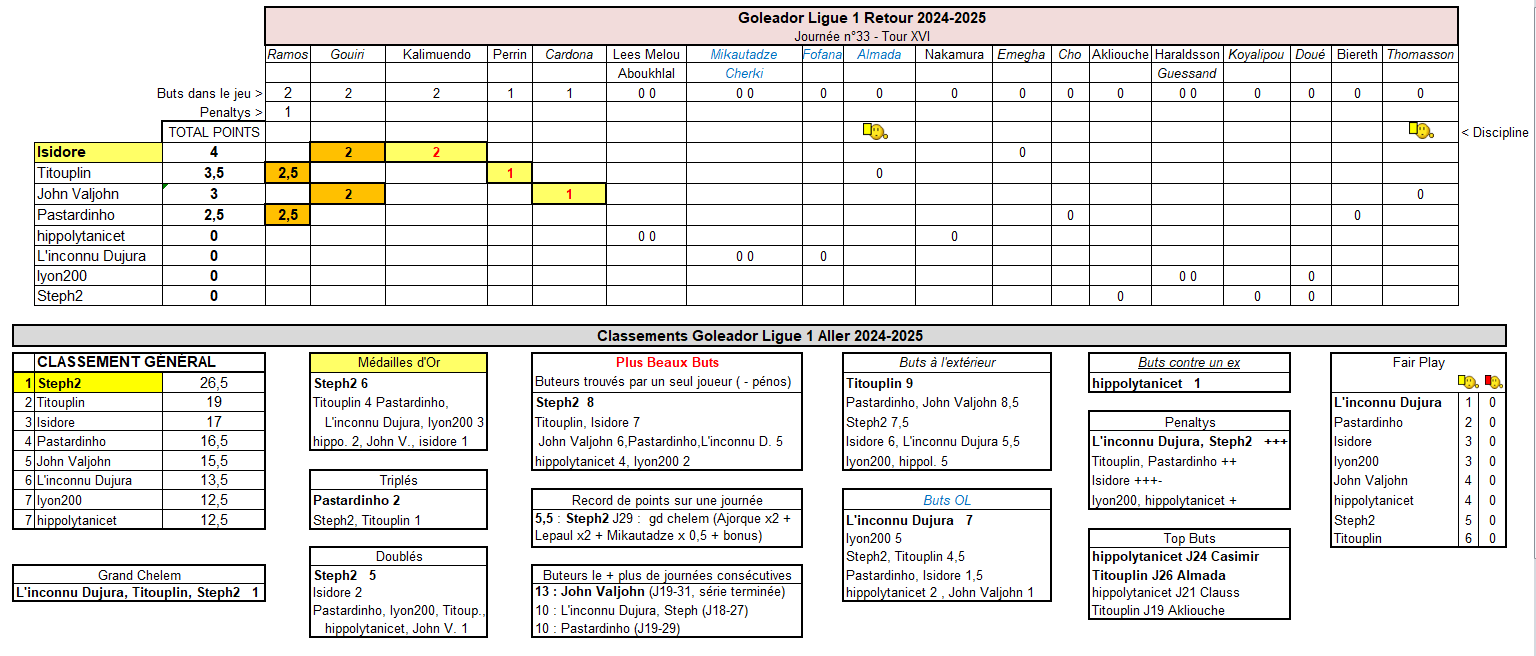 Posté(e) le 12 mai 2025le 12 mai Auteur comment_353612 GOLEADORIsidore (doublés de Gouiri et de Kalimuendo) décroche la médaille d'or ce tour ci.Titouplin, John Valjohn et Pastardinho ont eux aussi marqué plusieurs buts. Le leader Steph2 n'a rien marqué ce week-end, mais cela ne l'empêche pas de rester confortablement installé à la 1ère place, le titre de champion Goleador quasiment déjà dans la poche. Titouplin a pris une option sur la 2e place, avec 2 buts d'avance sur Isidore, remonté sur le podium après avoir été dernier du classement jusqu'à ces dernières semaines. Modifié le 12 mai 2025le 12 mai par Duel Prono Signaler