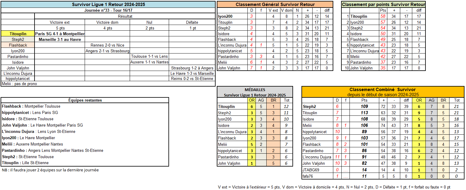 Posté(e) le 12 mai 2025le 12 mai Auteur comment_353610 SURVIVORVictoires à l'extérieur pour Titouplin et Steph2 qui avaient gardé de belles cartes pour cette 33e journée (respectivement Paris SG et Marseille).Mais lyon200 a décroché la victoire à domicile (Angers mettant fin à l'invincibilité de Strasbourg) qui lui permet de conserver la 1ère place au Classement général, à égalité de défaites avec Titouplin et Steph2, mais avec un plus grand nombre de victoires.Victorieux lui aussi ce tour-ci, Flashback conserve une petite chance de terminer premier à l'issue de la 34e et dernière journée samedi prochain, sur laquelle chacun devra jouer 2 équipes (et pas franchement des premiers choix :) ) Modifié le 12 mai 2025le 12 mai par Duel Prono Signaler