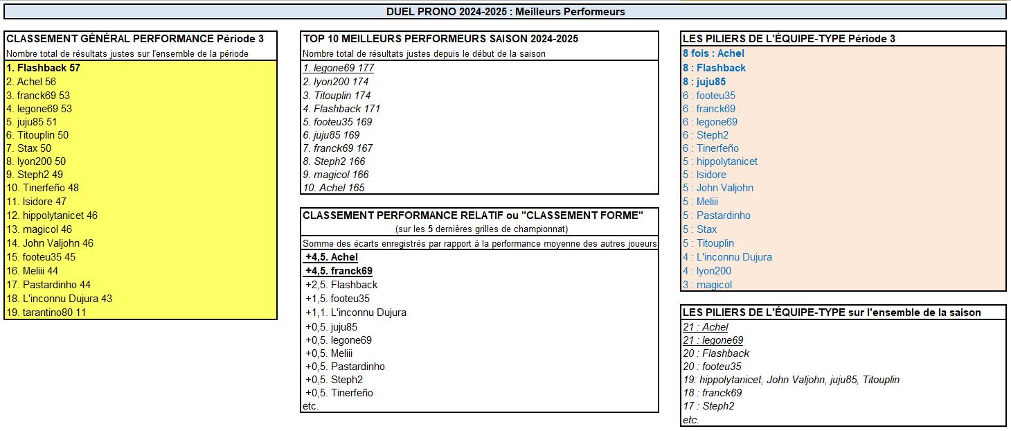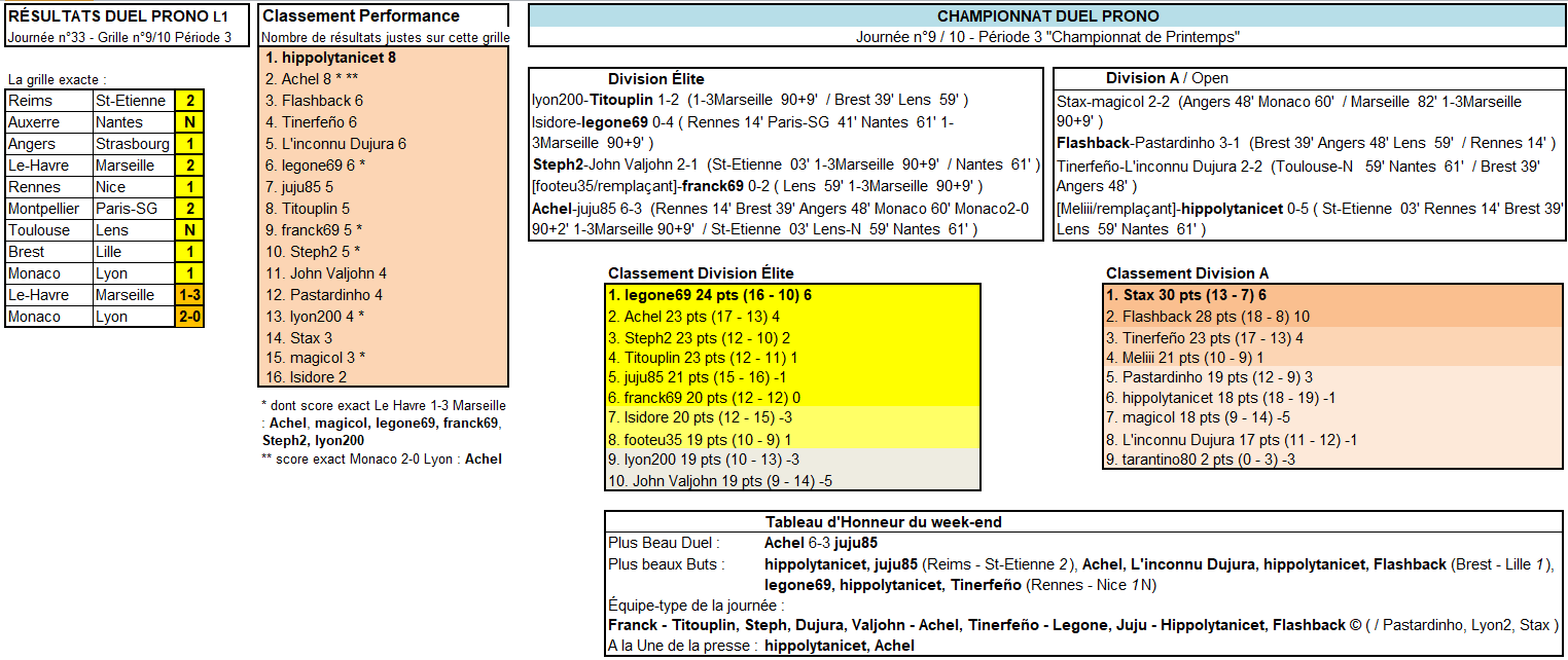 Posté(e) le 12 mai 2025le 12 mai comment_353604 DUEL PRONOGrand écart entre les premiers et les derniers sur cette grille.hippolytanicet a fait fort en trouvant 8 résultats 1N2 justes. Achel le rejoint avec 6 bons résultats + les 2 scores exacts.En Division Élite, legone69 conserve la 1ère place après avoir largement battu Isidore (4-0), par contre juju85 a chuté face à Achel au terme d'un duel très spectaculaire (6-3 !). Achel en profite pour prendre la 2ème place au goal-average, devant Steph2 et Titouplin, tous deux vainqueurs aussi ce week-end. C'est donc Achel qui défiera legone69 dans le duel pour la 1ère place lors de la dernière journée... tout en sachant que leurs deux poursuivants Steph2 et Titouplin, qui s'affronteront de leur côté, gardent mathématiquement une petite chance pour le titre.Dans la deuxième partie du tableau, tout peut arriver encore puisque 2 pts seulement séparent le 5e juju85 de lyon200 et John Valjohn, qui occupent les 2 dernières places avant le dernier round.En Division A, Stax et Flashback, déjà tous deux assurés de la montée, se rencontreront au dernier tour pour le titre de champion de cette division. Pour les places de barragiste, Tinerfeño tient le bon bout devant Meliii, mais Pastardinho, hippolytanicet, voire magicol peuvent encore viser la 4e place. Signaler