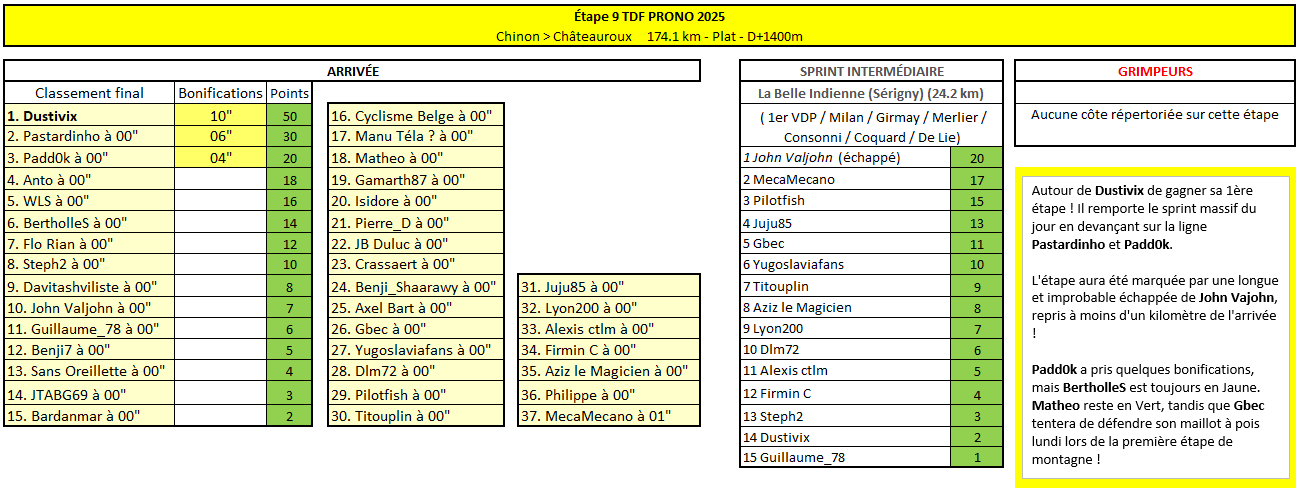 Posté(e) le 13 juillet 2025le 13 juil. comment_354588 TDF PRONOAutour de Dustivix de gagner sa 1ère étape ! Il remporte le sprint massif du jour en devançant sur la ligne Pastardinho et Padd0k.L'étape aura été marquée par une longue et improbable échappée de John Vajohn, repris à moins d'un kilomètre de l'arrivée !Padd0k a pris quelques bonifications, mais BertholleS est toujours en Jaune. Matheo reste en Vert, tandis que Gbec tentera de défendre son maillot à pois lundi lors de la première étape de montagne ! Signaler