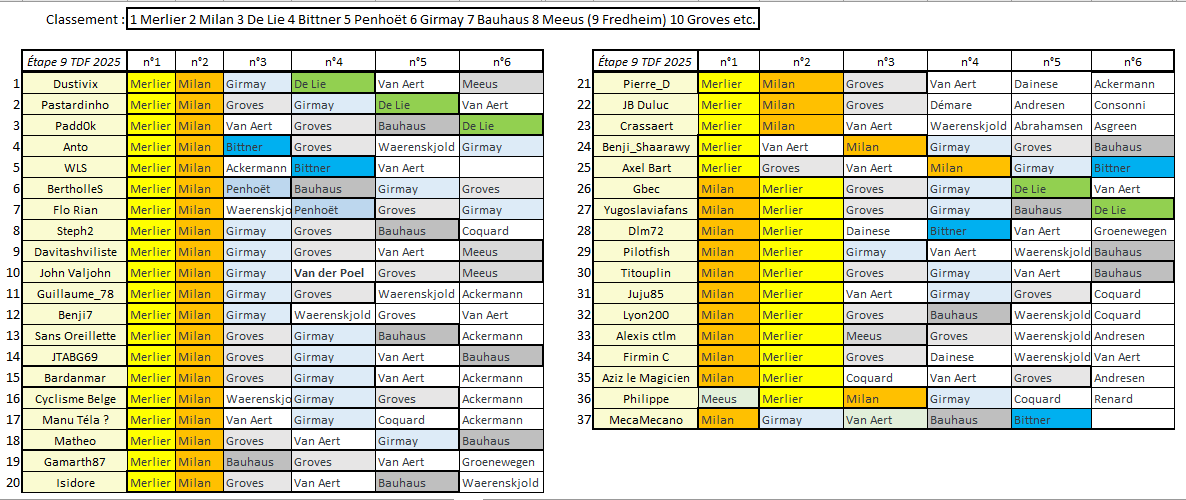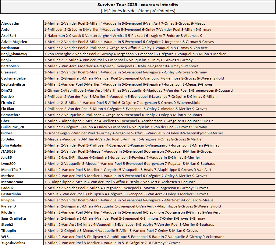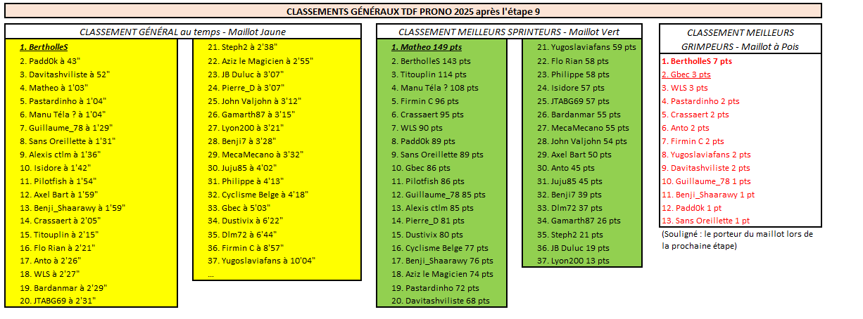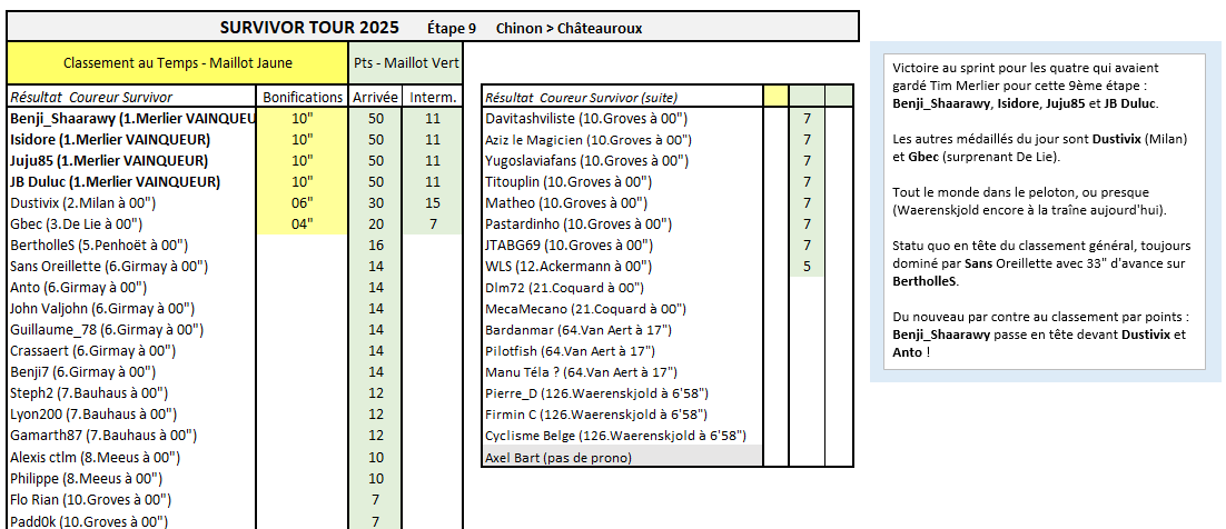 Posté(e) le 14 juillet 2025le 14 juil. Auteur comment_354593 SURVIVOR TOURVictoire au sprint pour les quatre qui avaient gardé Tim Merlier pour cette 9ème étape : Benji_Shaarawy, Isidore, Juju85 et JB Duluc.Les autres médaillés du jour sont Dustivix (Milan) et Gbec (surprenant De Lie).Tout le monde dans le peloton, ou presque (Waerenskjold encore à la traîne aujourd'hui).Statu quo en tête du classement général, toujours dominé par Sans Oreillette avec 33" d'avance sur BertholleS.Du nouveau par contre au classement par points : Benji_Shaarawy passe en tête devant Dustivix et Anto ! Signaler
