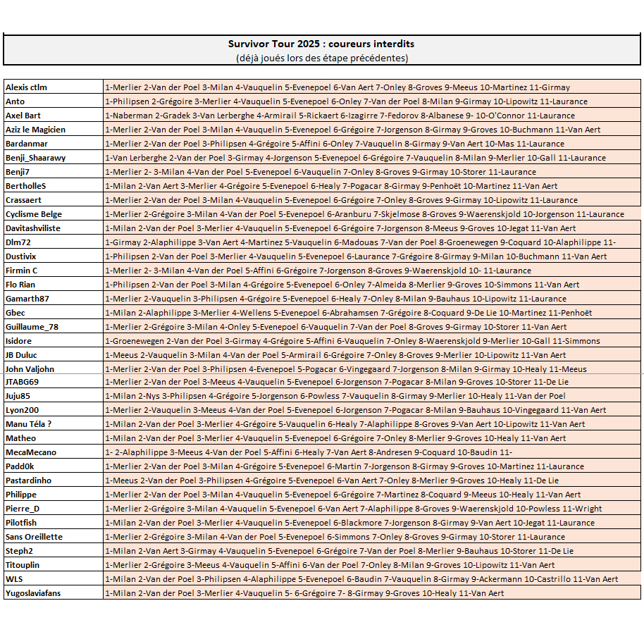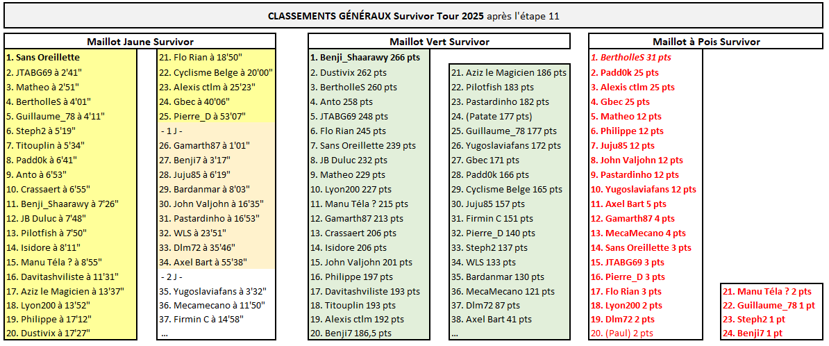 Aucun des 20 premiers du classement général Survivor ne s'est fait piéger par la victoire des échappés, statuo quo en tête donc ! Sans Oreillette est toujours leader avec une petite marge d'avance sur JTABG69 et Matheo, suivis par BertholleS, qui conserve le maillot à pois en attendant les grosses manœuvres en montagne.