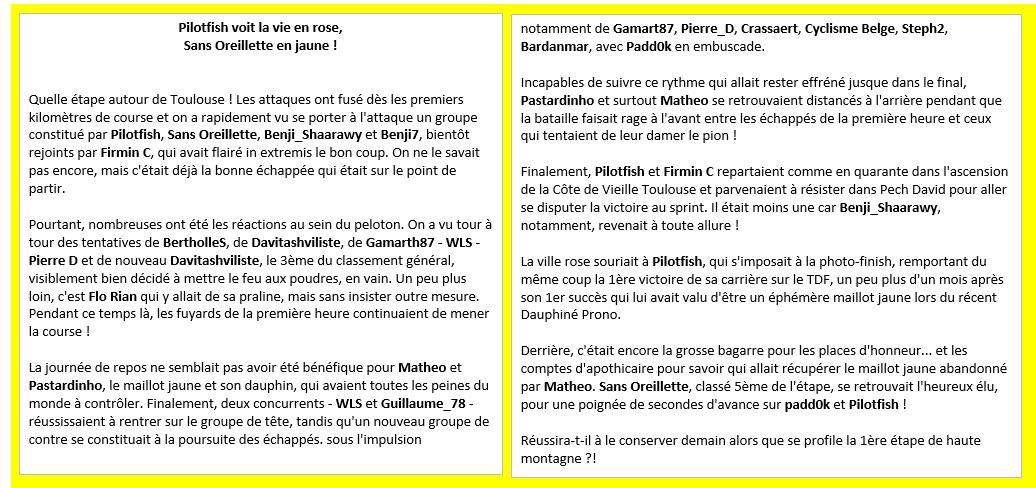 Derrière, c'était encore la grosse bagarre pour les places d'honneur... et les comptes d'apothicaire pour savoir qui allait récupérer le maillot jaune abandonné par Matheo. Sans Oreillette, classé 5ème de l'étape, se retrouvait l'heureux élu, pour une poignée de secondes d'avance sur padd0k et Pilotfish !