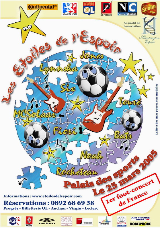 Posté(e) le 1 mars 200521 a comment_64006 Pour lutter contre la maladie d'Huntington... Si, ce foot concert vous interresse, faites le moi savoir.... Tarif : Concert uniquement 20? Foot-concert placement libre 25? Foot-concert en "Carré Or" avec places numérotées à 45? PS : la date : 25/03/2005 Modifié le 1 mars 200521 a par $ynop$ "Les cons ça ose tout, c'est même à ça qu'on les reconnaît." [Audiard] "Si vous ne pouvez pas répondre à l'argument de quelqu'un, tout n'est pas perdu. Vous pouvez encore l'injurier." [ Elbert Hubbard ] Signaler