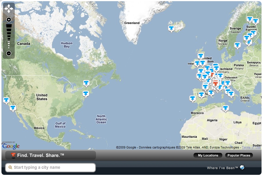 Posté(e) le 12 janvier 200917 a comment_208902 Ils devraient faire des épingles encore plus grosses...on devine à peine où tu es allé en Europe. Ce n'est qu'une capture d'écran. Dans la vraie appli, tu peux zoomer et choisir de naviguer par pays ou par ville. C'est très précis et je n'ai pas réussi à le planter avec un village perdu même s'il faut parfois aller fouiller dans la carte pour trouver le lieu-dit. Mon profil, si ça t'intéresse : http://www.whereivebeen.com/profile?id=83409# Et en passant, je veux bien tes plans sortie et bouffe à London-sur-Tamise. Signaler