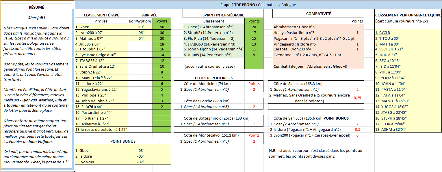 Victoire de Gbec qui a conservé quelques secondes d'avance sur ses poursuivants après une longue chevauchée (Abrahamsen joué n°5) ! Il conforte bien sûr son maillot jaune du TDF Prono. Lyon200 prend la 2ème place sur le fil (Carapaz joué n°4) devant Matheo et Juju85 (Evenepoel n°1), Titouplin (n°2) et Cyclisme Belge (n°3).