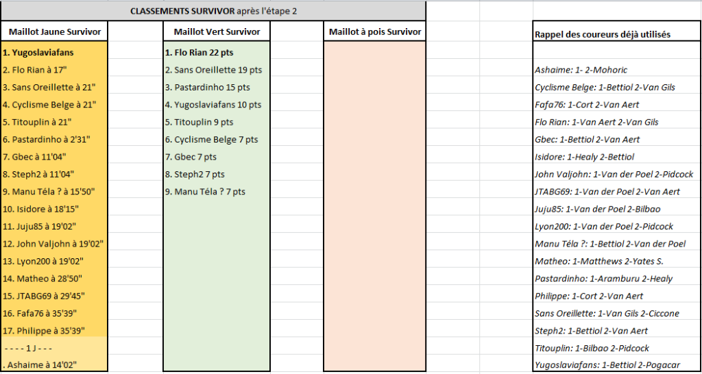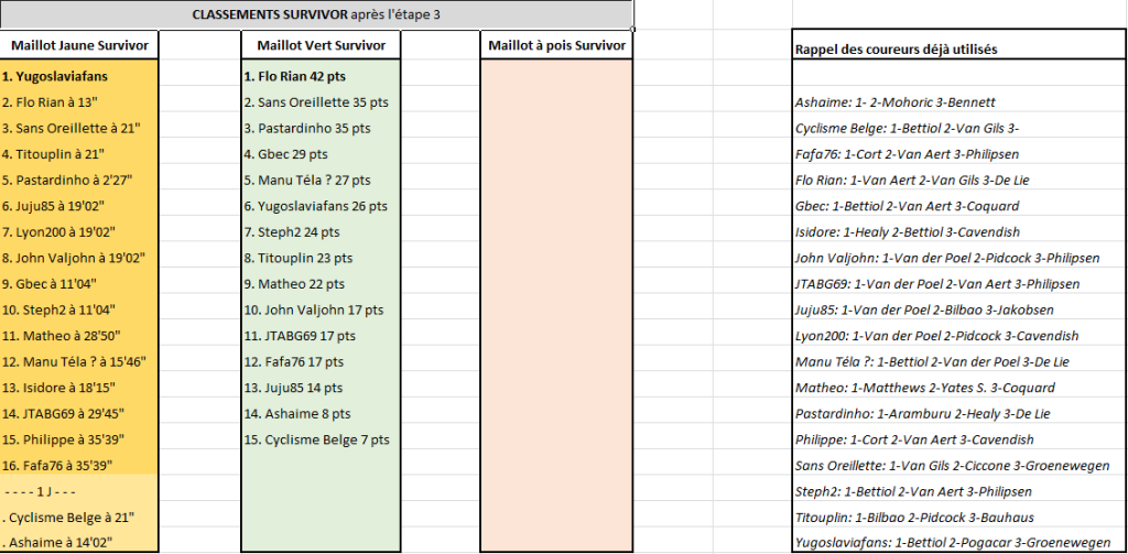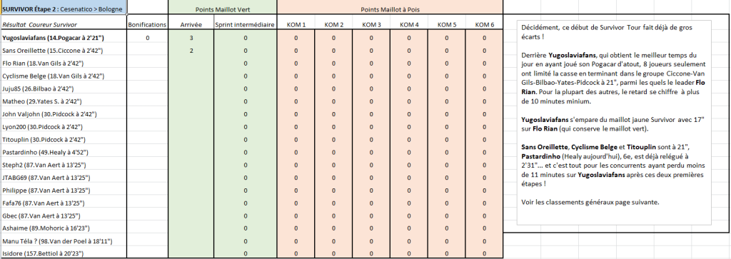 Au Survivor, c'est Yugoslaviafans qui est arrivé le premier en ayant abattu la carte Pogi dès cette étape (14e Pogacar), il a conservé 21" d'avance sur Sans Oreillette (Ciccone 15e), Flo Rian, Cyclisme Belge (Van Gils 18e), Juju85 (Bilbao 26e), Matheo (S.Yates 29e) et John Valjohn, Lyon200, Titouplin (Pidcock 30e). Yugoslaviafans prend le maillot jaune Survivor.