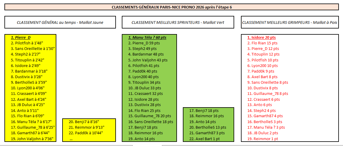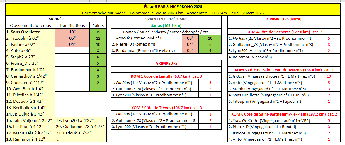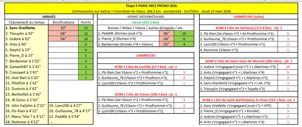 Victoire de Sans Oreillette devant Titouplin et Isidore ! Bonne opération pour les 7 qui avaient Vingegaard en n°1 aujourd'hui. Pierre_D devrait prendre le maillot jaune Top 10 provisoire de cette 5e étape : 1 Sans Oreillette 2 Titouplin 3 Isidore 4 Anto 5 Steph2 6 Pierre_D 7 Bardanmar --- 8 Gamarth87 9 Crassaert 10 Axel Bart - Étape 6 - Paris-Nice Prono & Survivor 2026