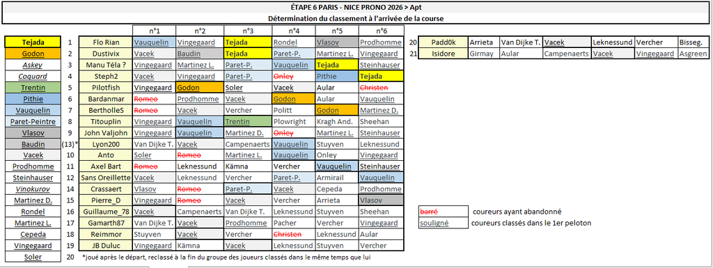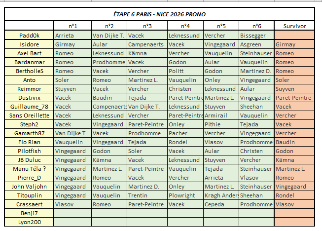 Paris-Nice Prono & Survivor 2026 - Étape 6 : Barbentane > Apt 179.3 km - Accidentée - D+2077m Départ de l'étape : vendredi 13 mars à 12h40 --- Coureur n°1 : Coureur n°2 : Coureur n°3 : Coureur n°4 : Coureur n°5 : Coureur n°6 : --- Survivor Étape 06 : ----------- Top coureurs avant cette étape : Les principaux favoris pour le classement général final, par ordre alphabétique : [à confirmer] Baudin, Izagirre, Martinez D., Martinez L., Onley, Rondel, Soler, Steinhauser, Tejada, Vauquelin, Vingegaard ----------- -------------------------------------------------------------------- Vos coureurs interdits au jeu Survivor (coureurs déjà joués sur les étapes précédentes) Anto : 1-Vauquelin 2-Girmay 3-Armirail 4-Ayuso 5-Vauquelin Axel Bart : 1- 2-Fretin 3-Pithie 4-Martinez D. 5-Soler Bardanmar : 1-Lamperti 2-Girmay 3-Affini 4-Vingegaard 5-Soler Benji7 : 1-Pithie 2-Girmay 3-Vauquelin 4-Ayuso 5- BertholleS : 1-Godon 2-Girmay 3-Affini 4-Ayuso 5-Vauquelin Crassaert : 1-Aular 2-Lamperti 3-Vingegaard 4-Ayuso 5-Vauquelin Dustivix : 1-Pithie 2-Fretin 3-Soderqvist 4-Ayuso 5-Vacek Flo Rian : 1-Godon 2-Bauhaus 3-Affini 4-Tejada 5-Vlasov Gamarth87 : 1-Vacek 2-Girmay 3-Soderqvist 4-Martinez L. 5-Vauquelin Guillaume_78 : 1- 2-Girmay 3-Soderqvist 4-Vauquelin 5-Arrieta Isidore : 1-Godon 2-Van Uden 3-Rodriguez Ca. 4-Onley 5-Martinez D. JB Duluc : 1-Vacek 2-Fretin 3-Romeo 4-Martinez L. 5-Vauquelin John Valjohn : 1-Martinez D. 2-Girmay 3-Zingle 4-Onley 5-Vauquelin Manu Téla ? : 1-Lamperti 2-Girmay 3- 4-Ayuso 5-Lapeira Padd0k : 1-Pithie 2-Girmay 3-Jorgenson 4-Onley 5-Arrieta Pierre_D : 1-Godon 2-Girmay 3-Armirail 4-Vingegaard 5-Vauquelin Pilotfish : 1-Romeo 2-Girmay 3-Affini 4-Vauquelin 5-Martinez L. Reimmor : 1-Vacek 2-Fretin 3-Armirail 4-Martinez L. 5-Arrieta Sans Oreillette : 1-Vacek 2-Girmay 3-Soderqvist 4-Onley 5-Paret-Peintre Steph2 : 1-Girmay 2-Lamperti 3-Campenaerts 4-Onley 5-Vauquelin Titouplin : 1-Godon 2-Ackermann 3-McNulty 4-Martinez L. 5-Tejada- Étape 5 - Paris-Nice Prono & Survivor 2026
