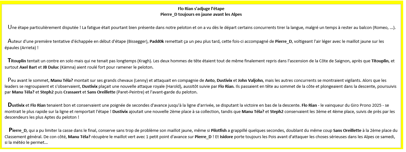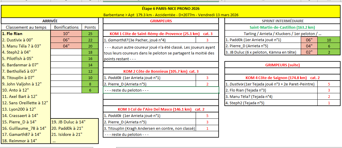 PARIS-NICE PRONO Flo Rian s'adjuge l'étape Pierre_D toujours en jaune avant les Alpes Une étape particulièrement disputée ! La fatigue était pourtant bien présente dans notre peloton et on a vu dès le départ certains concurrents tirer la langue, malgré un temps à rester au balcon (Romeo, ...). Auteur d'une première tentative d'échappée en début d'étape (Bissegger), Padd0k remettait ça un peu plus tard, cette fois-ci accompagné de Pierre_D, voltigeant l'air léger avec le maillot jaune sur les épaules (Arrieta) ! Titouplin tentait un contre en solo mais qui ne tenait pas longtemps (Kragh). Les deux hommes de tête étaient tout de même finalement repris dans l'ascension de la Côte de Saignon, après que Titouplin, et surtout Axel Bart et JB Duluc (Kämna) aient roulé fort pour ramener le peloton. Peu avant le sommet, Manu Téla? montait sur ses grands chevaux (Lenny) et attaquait en compagnie de Anto, Dustivix et John Valjohn, mais les autres concurrents se montraient vigilants. Alors que les leaders se regroupaient et s'observaient, Dustivix plaçait une nouvelle attaque royale (Harold), aussitôt suivie par Flo Rian. Ils passaient en tête au sommet de la côte et plongeaient dans la descente, poursuivis par Manu Téla? et Steph2 puis Crassaert et Sans Oreillette (Paret-Peintre) et l'avant-garde du peloton. Dustivix et Flo Rian tenaient bon et conservaient une poignée de secondes d'avance jusqu'à la ligne d'arrivée, se disputant la victoire en bas de la descente. Flo Rian - le vainqueur du Giro Prono 2025 - se montrait le plus rapide sur la ligne et remportait l'étape ! Dustivix ajoutait une nouvelle 2ème place à sa collection, tandis que Manu Téla? et Steph2 conservaient les 3ème et 4ème place, suivis de près par les descendeurs les plus Aptes du peloton ! Pierre_D, qui a pu limiter la casse dans le final, conserve sans trop de problème son maillot jaune, même si Pilotfish a grappillé quelques secondes, doublant du même coup Sans Oreillette à la 2ème place du Classement général. De con côté, Manu Téla? récupère le maillot vert avec 1 petit point d'avance sur Pierre_D ! Et Isidore porte toujours les Pois avant d'attaquer les choses sérieuses dans les Alpes ce samedi, si la météo le permet...