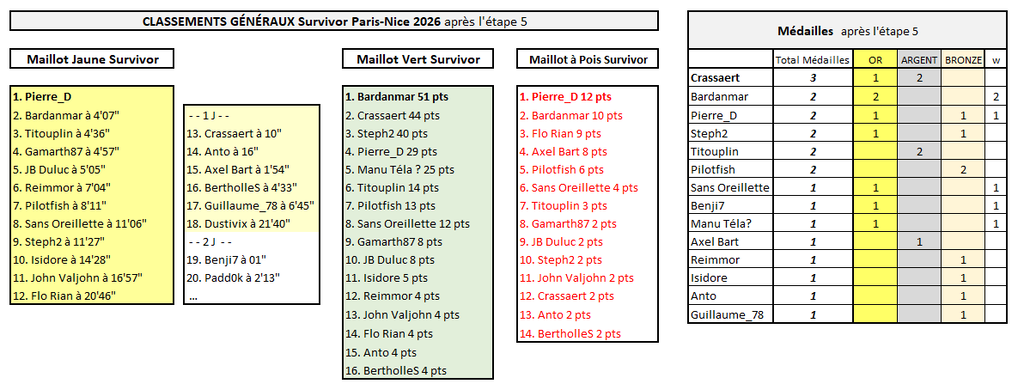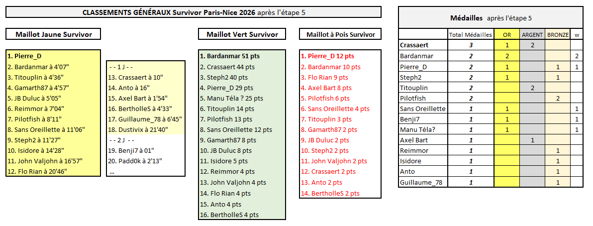 SURVIVOR PARIS-NICE Champion des médailles sur ce Survivor Paris-Nice, Crassaert termine en beauté par une superbe victoire sur la Promenade des Anglais (Lenny Martinez) ! Il y avait évidemment beaucoup plus de monde sur Vingegaard sur ce final : 2ème place pour JB Duluc, Reimmor, Dustivix, Steph2, Gamarth87, BertholleS, Titouplin, Isidore, Axel Bart, Padd0k et Sans Oreillette. Et encore une médaille de bronze pour Bardanmar (grâce au nouveau podium décroché par Tejada). Titouplin remporte ce premier Survivor Paris-Nice et ajoute donc un nouveau titre à son impressionnante collection, puisqu'il avait déjà gagné Survivor Giro et Survivor Dauphiné l'an dernier, et trois fois le Survivor Tour par le passé ! Le podium de ce Survivor Paris-Nice est complété par Gamath87 (2e à 41") et par JB Duluc (3ème à 2'51"), deux concurrents qui s'étaient déjà illustrés lors du dernier Survivor Vuelta (1er JB 2e Crassaert 3e Gamarth). On rappelle que les abandons ont joué un rôle prépondérant cette semaine. Celui d'Ayuso a coûté très cher notamment à Crassaert, mais aussi à Benji7, leader après les 3 premières étapes, tandis que celui de Romeo fait chuter Pierre_D et Bardanmar qui occupaient alors les deux premières places du Classement Général... Crassaert pourra tout de même se consoler avec le maillot vert (qu'il avait déjà remporté au Survivor Vuelta), tandis que Pierre_D a conservé jusqu'au bout le maillot à pois (bien défendu sur la dernière étape grâce à Paret-Peintre).