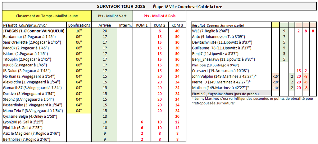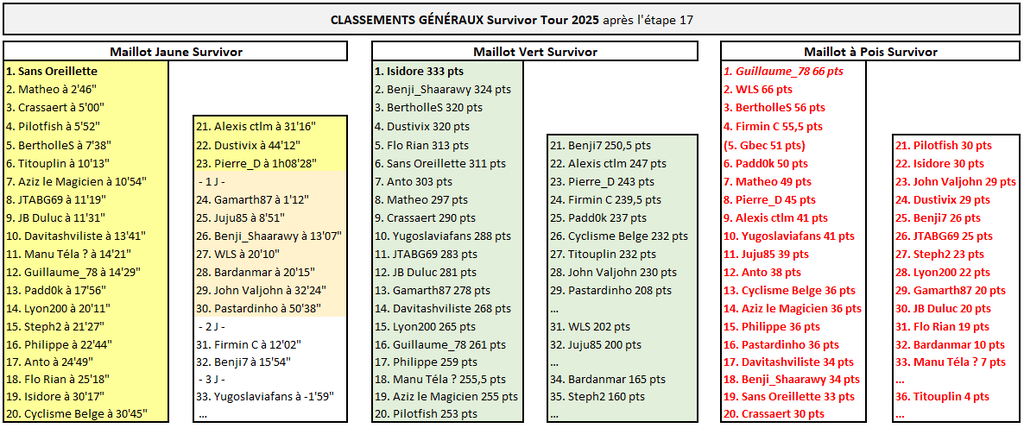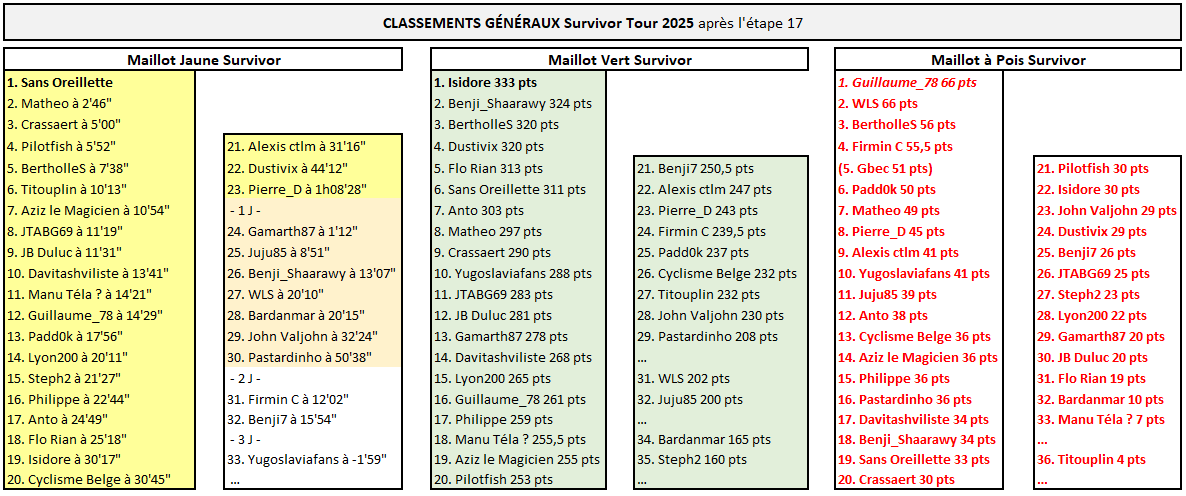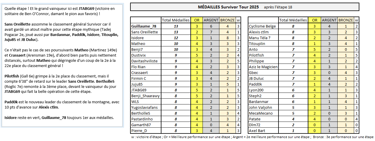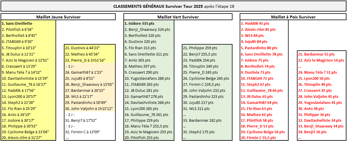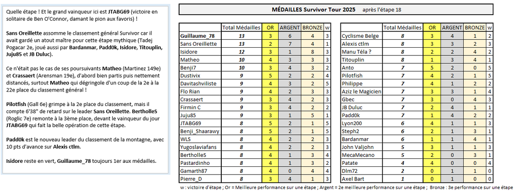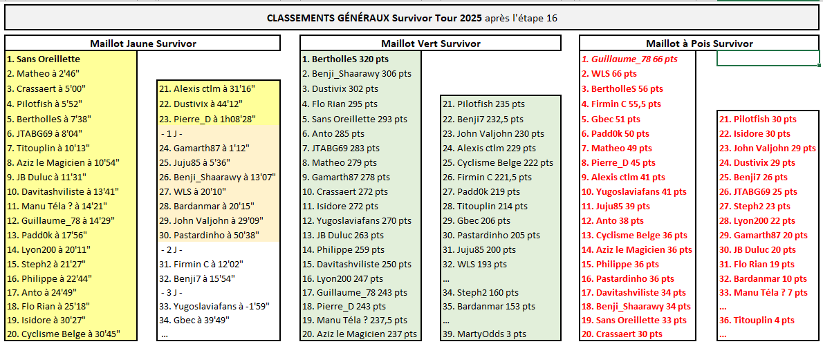 SURVIVOR TOUR Quelle étape ! Et le grand vainqueur ici est JTABG69 (victoire en solitaire de Ben O'Connor, damant le pion aux favoris) ! Sans Oreillette assomme le classement général Survivor car il avait gardé un atout maître pour cette étape mythique (Tadej Pogacar 2e, joué aussi par Bardanmar, Padd0k, Isidore, Titouplin, Juju85 et JB Duluc). Ce n'était pas le cas de ses poursuivants Matheo (Martinez 149e) et Crassaert (Arensman 19e), d'abord bien partis puis nettement distancés, surtout Matheo qui dégringole d'un coup de la 2e à la 22e place du classement général ! Pilotfish (Gall 6e) grimpe à la 2e place du classement, mais il compte 6'38" de retard sur le leader Sans Oreillette. BertholleS (Roglic 7e) remonte à la 3ème place, devant le vainqueur du jour JTABG69 qui fait la belle opération de cette étape. Padd0k est le nouveau leader du classement de la montagne, avec 10 pts d'avance sur Alexis ctlm. Isidore reste en vert, Guillaume_78 toujours 1er aux médailles.