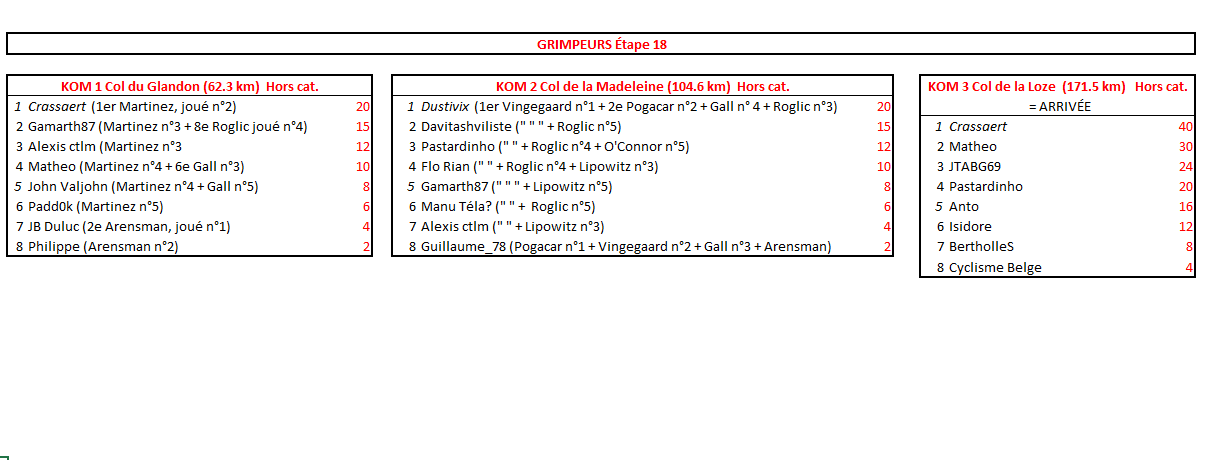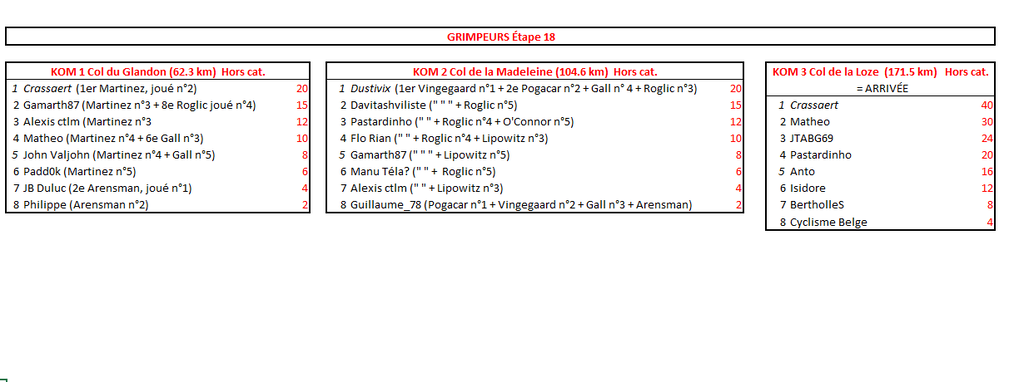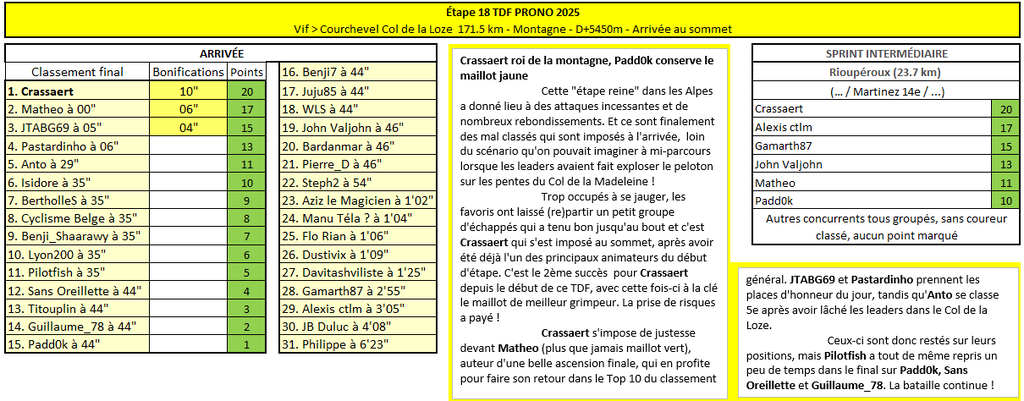 TDF PRONO Crassaert roi de la montagne, Padd0k conserve le maillot jaune Cette "étape reine" dans les Alpes a donné lieu à des attaques incessantes et de nombreux rebondissements. Et ce sont finalement des mal classés qui sont imposés à l'arrivée, loin du scénario qu'on pouvait imaginer à mi-parcours lorsque les leaders avaient fait exploser le peloton sur les pentes du Col de la Madeleine ! Trop occupés à se jauger, les favoris ont laissé (re)partir un petit groupe d'échappés qui a tenu bon jusqu'au bout et c'est Crassaert qui s'est imposé au sommet, après avoir été déjà l'un des principaux animateurs du début d'étape. C'est le 2ème succès pour Crassaert depuis le début de ce TDF, avec cette fois-ci à la clé le maillot de meilleur grimpeur. La prise de risques a payé ! Crassaert s'impose de justesse devant Matheo (plus que jamais maillot vert), auteur d'une belle ascension finale, qui en profite pour faire son retour dans le Top 10 du classement général. JTABG69 et Pastardinho prennent les places d'honneur du jour, tandis qu'Anto se classe 5e après avoir lâché les leaders dans le Col de la Loze. Ceux-ci sont donc restés sur leurs positions, mais Pilotfish a tout de même repris un peu de temps dans le final sur Padd0k, Sans Oreillette et Guillaume_78. La bataille continue !