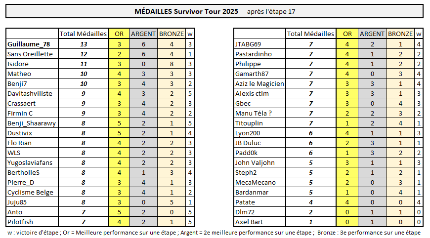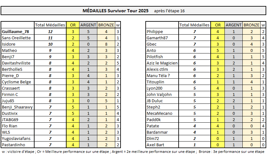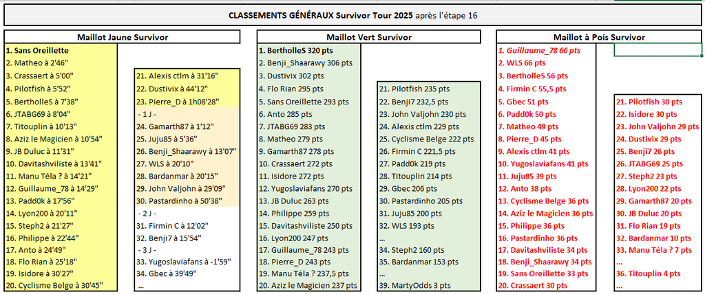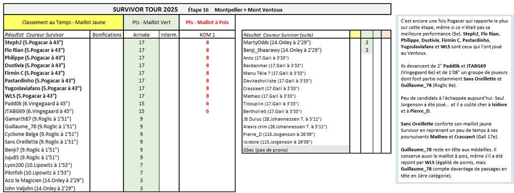 SURVIVOR TOUR C'est encore une fois Pogacar qui rapporte le plus sur cette étape, même si ce n'était pas sa meilleure performance (5e). Steph2, Flo Rian, Philippe, Dustivix, Firmin C, Pastardinho, Yugoslaviafans et WLS sont ceux qui l'ont joué au Ventoux. Ils devancent de 2" Padd0k et JTABG69 (Vingegaard 6e) et de 1'08" un groupe de joueurs dont font partie notamment Sans Oreillette et Guillaume_78 (Roglic 9e). Peu de candidats à l'échappée aujourd'hui. Seul Jorgenson a été joué... et il a coûté cher à Isidore et à Pierre_D. Sans Oreillette conforte son maillot jaune Survivor en reprenant un peu de temps à ses poursuivants Matheo et Crassaert (Gall 17e). Guillaume_78 reste en tête aux médailles. Il conserve aussi le maillot à pois, même s'il a été rejoint par WLS (égalité de points, mais Guillaume_78 compte davantage de passages en tête en 1ère catégorie).