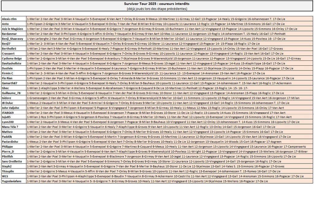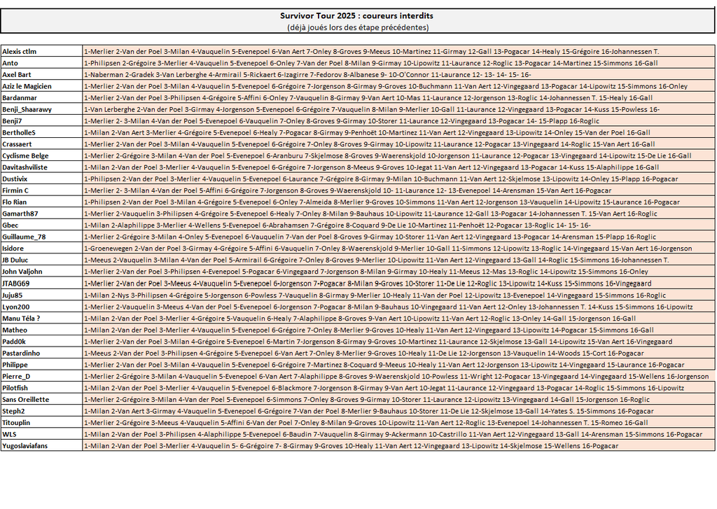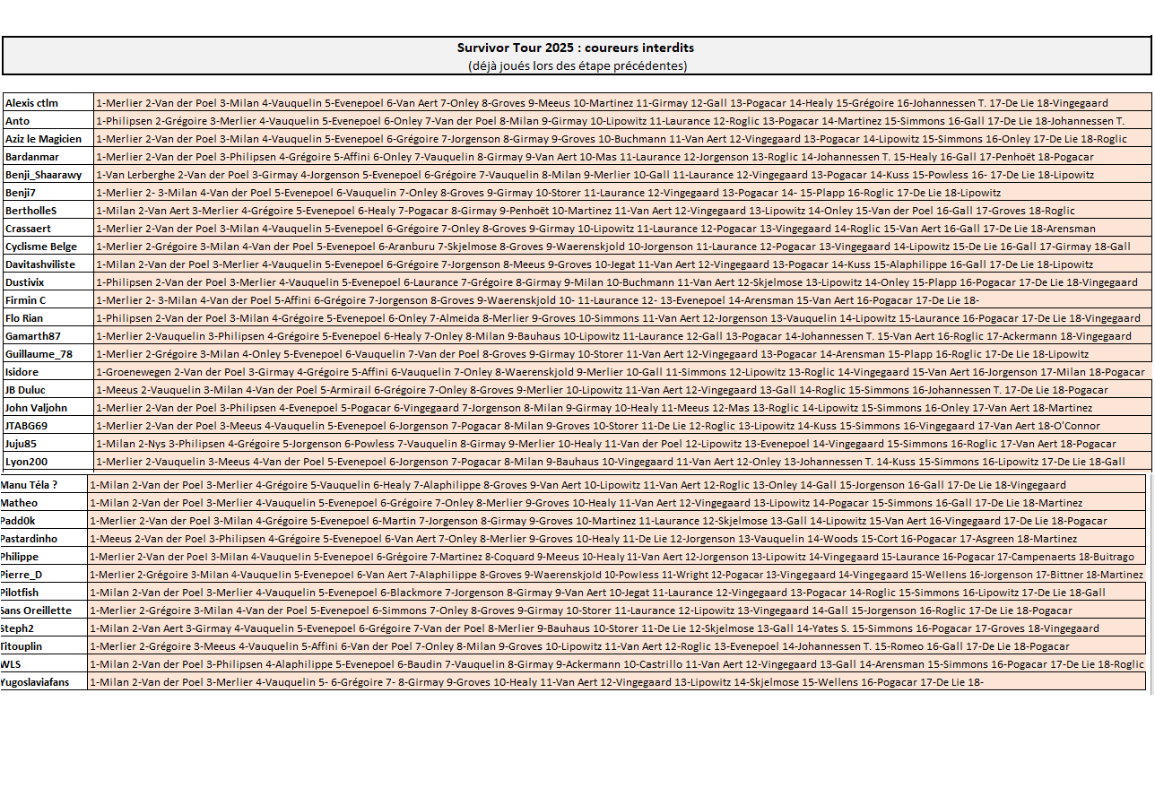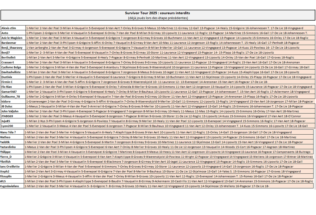 TDF Prono & Survivor Tour 2025 - Étape 20 : Nantua > Pontarlier 184.2 km - Accidentée - D+2900m Départ : Samedi 26 juillet à 12h05 --- Coureur n°1 : Coureur n°2 : Coureur n°3 : Coureur n°4 : Coureur n°5 : --- Survivor Étape 20 : ----------- Top coureurs avant cette étape : Le Top 10 du classement général : Pogačar, Vingegaard, Lipowitz, Onley, Gall, Johannessen T., Vauquelin, Roglic, Healy, O'Connor ----------- -------------------------------------------------------------------- Vos coureurs interdits au jeu Survivor (coureurs déjà joués sur les étapes précédentes)