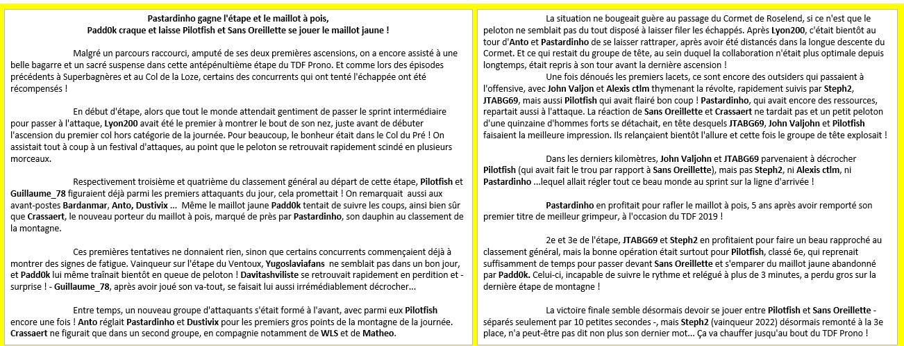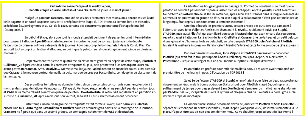 TDF PRONO Pastardinho gagne l'étape et le maillot à pois, Padd0k craque et laisse Pilotfish et Sans Oreillette se jouer le maillot jaune ! Malgré un parcours raccourci, amputé de ses deux premières ascensions, on a encore assisté à une belle bagarre et un sacré suspense dans cette antépénultième étape du TDF Prono. Et comme lors des épisodes précédents à Superbagnères et au Col de la Loze, certains des concurrents qui ont tenté l'échappée ont été récompensés ! En début d'étape, alors que tout le monde attendait gentiment de passer le sprint intermédiaire pour passer à l'attaque, Lyon200 avait été le premier à montrer le bout de son nez, juste avant de débuter l'ascension du premier col hors catégorie de la journée. Pour beaucoup, le bonheur était dans le Col du Pré ! On assistait tout à coup à un festival d'attaques, au point que le peloton se retrouvait rapidement scindé en plusieurs morceaux. Respectivement troisième et quatrième du classement général au départ de cette étape, Pilotfish et Guillaume_78 figuraient déjà parmi les premiers attaquants du jour, cela promettait ! On remarquait aussi aux avant-postes Bardanmar, Anto, Dustivix ... Même le maillot jaune Padd0k tentait de suivre les coups, ainsi bien sûr que Crassaert, le nouveau porteur du maillot à pois, marqué de près par Pastardinho, son dauphin au classement de la montagne. Ces premières tentatives ne donnaient rien, sinon que certains concurrents commençaient déjà à montrer des signes de fatigue. Vainqueur sur l'étape du Ventoux, Yugoslaviafans ne semblait pas dans un bon jour, et Padd0k lui même traînait bientôt en queue de peloton ! Davitashviliste se retrouvait rapidement en perdition et - surprise ! - Guillaume_78, après avoir joué son va-tout, se faisait lui aussi irrémédiablement décrocher... Entre temps, un nouveau groupe d'attaquants s'était formé à l'avant, avec parmi eux Pilotfish encore une fois ! Anto réglait Pastardinho et Dustivix pour les premiers gros points de la montagne de la journée. Crassaert ne figurait que dans un second groupe, en compagnie notamment de WLS et de Matheo. La situation ne bougeait guère au passage du Cormet de Roselend, si ce n'est que le peloton ne semblait pas du tout disposé à laisser filer les échappés. Après Lyon200, c'était bientôt au tour d'Anto et Pastardinho de se laisser rattraper, après avoir été distancés dans la longue descente du Cormet. Et ce qui restait du groupe de tête, au sein duquel la collaboration n'était plus optimale depuis longtemps, était repris à son tour avant la dernière ascension ! Une fois dénoués les premiers lacets, ce sont encore des outsiders qui passaient à l'offensive, avec John Valjon et Alexis ctlm thymenant la révolte, rapidement suivis par Steph2, JTABG69, mais aussi Pilotfish qui avait flairé bon coup ! Pastardinho, qui avait encore des ressources, repartait aussi à l'attaque. La réaction de Sans Oreillette et Crassaert ne tardait pas et un petit peloton d'une quinzaine d'hommes forts se détachait, en tête desquels JTABG69, John Valjohn et Pilotfish faisaient la meilleure impression. Ils relançaient bientôt l'allure et cette fois le groupe de tête explosait ! Dans les derniers kilomètres, John Valjohn et JTABG69 parvenaient à décrocher Pilotfish (qui avait fait le trou par rapport à Sans Oreillette), mais pas Steph2, ni Alexis ctlm, ni Pastardinho ...lequel allait régler tout ce beau monde au sprint sur la ligne d'arrivée ! Pastardinho en profitait pour rafler le maillot à pois, 5 ans après avoir remporté son premier titre de meilleur grimpeur, à l'occasion du TDF 2019 ! 2e et 3e de l'étape, JTABG69 et Steph2 en profitaient pour faire un beau rapproché au classement général, mais la bonne opération était surtout pour Pilotfish, classé 6e, qui reprenait suffisamment de temps pour passer devant Sans Oreillette et s'emparer du maillot jaune abandonné par Padd0k. Celui-ci, incapable de suivre le rythme et relégué à plus de 3 minutes, a perdu gros sur la dernière étape de montagne ! La victoire finale semble désormais devoir se jouer entre Pilotfish et Sans Oreillette - séparés seulement par 10 petites secondes -, mais Steph2 (vainqueur 2022) désormais remonté à la 3e place, n'a peut-être pas dit non plus son dernier mot... Ça va chauffer jusqu'au bout du TDF Prono !