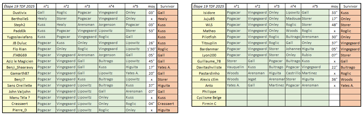 Coureur n°1 : Pogacar Coureur n°2 : Vingegaard Coureur n°3 : Roglic Coureur n°4 : Gall Coureur n°5 : Onley écart entre 1er et 2e : 37" --- Survivor Étape 19 : Vingegaard