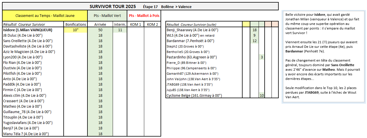 SURVIVOR TOUR Belle victoire pour Isidore, qui avait gardé Jonathan Milan (vainqueur à Valence) et qui fait du même coup une superbe opération au classement par points : il s'empare du maillot vert Survivor ! Viennent ensuite les 21 (!!) joueurs qui avaient pris Arnaud De Lie sur cette étape (4e), puis Bardanmar (Penhoët 7e). Pas de changement en tête du classement général, toujours dominé par Sans Oreillette avec 2'46" d'avance sur Matheo. Mais il pourrait y avoir encore des écarts importants sur les dernières étapes... Seule modification dans le Top 10, les 2 places perdues par JTABG69, suite à l'échec de Wout Van Aert.
