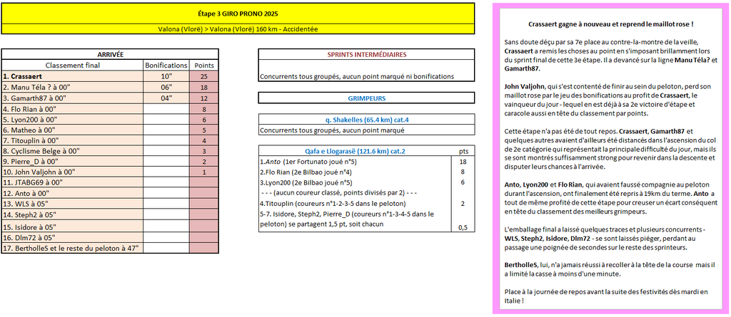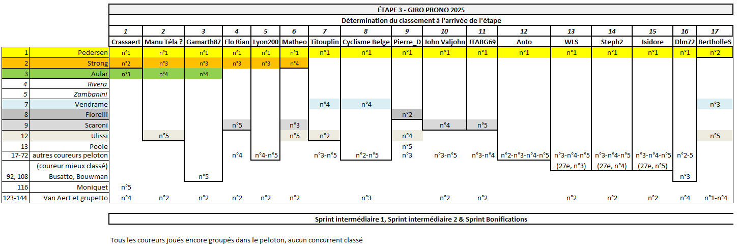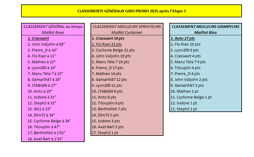 GIRO PRONO Classement 3e étape du Giro Prono 2025 : 1 Crassaert 2 Manu Téla? 3 Gamarth87 4 Flo Rian 5 Lyon200 6 Matheo 7 Titouplin 8 Cyclisme Belge 9 Pierre_D 10 John Valjohn 11 JTABG69 12 Anto ...à 00" 13 WLS 14 Steph2 15 Isidore 16 Dlm72 ...à 05" 17. BertholleS et peloton à 47" (à suivre)