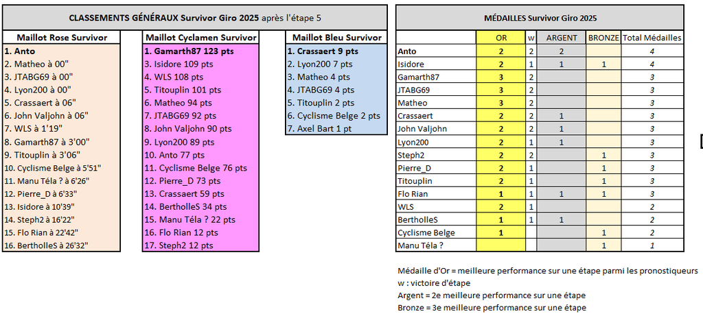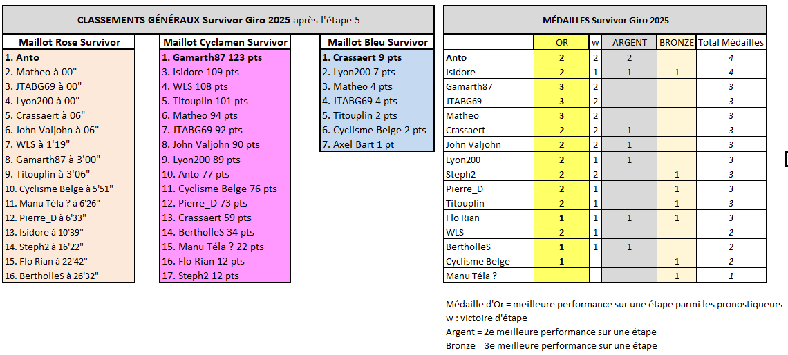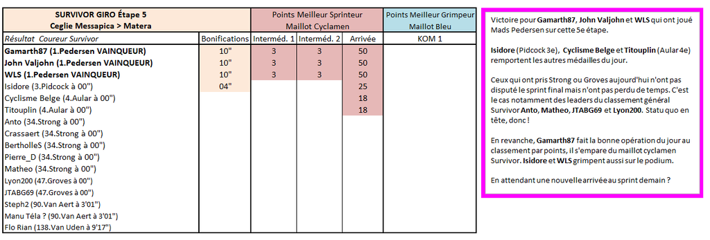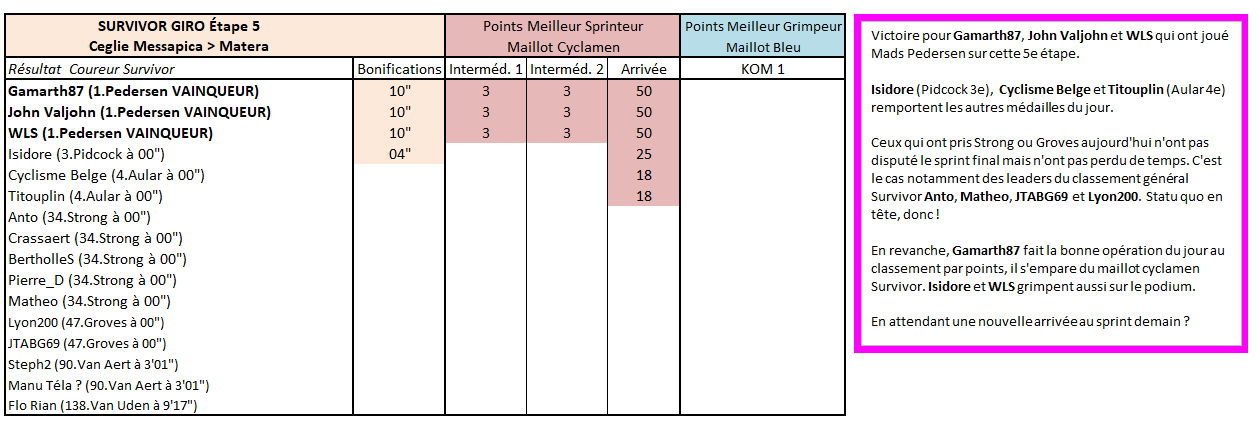 SURVIVOR GIRO Victoire pour Gamarth87, John Valjohn et WLS qui ont joué Mads Pedersen sur cette 5e étape. Isidore (Pidcock 3e), Cyclisme Belge et Titouplin (Aular 4e) remportent les autres médailles du jour. Ceux qui ont pris Strong ou Groves aujourd'hui n'ont pas disputé le sprint final mais n'ont pas perdu de temps. C'est le cas notamment des leaders du classement général Survivor Anto, Matheo, JTABG69 et Lyon200. Statu quo en tête, donc ! En revanche, Gamarth87 fait la bonne opération du jour au classement par points, il s'empare du maillot cyclamen Survivor. Isidore et WLS grimpent aussi sur le podium. En attendant une nouvelle arrivée au sprint demain ?