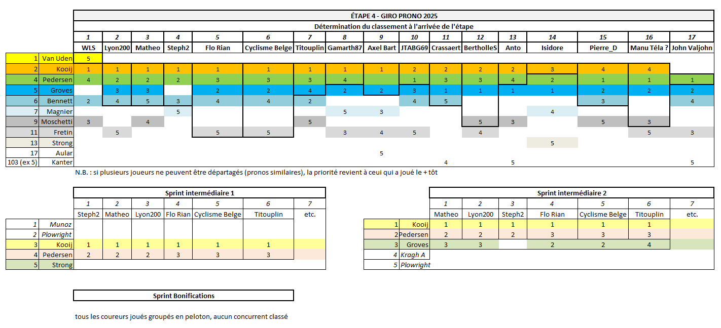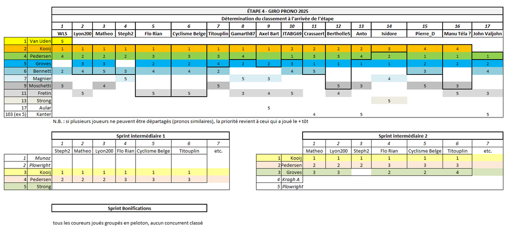 WLS (Van Uden joué n°5) dame le pion des favoris et remporte le sprint de cette 4e étape. Bravo ! C'était serré pour la 2e place, a priori c'est Lyon200 qui la prend devant Matheo et Steph2 (2e Kooij n°1 + 4e Pedersen n°2), puis Flo Rian, Cyclisme Belge et Titouplin (Kooij n°1 + Pedersen n°3)