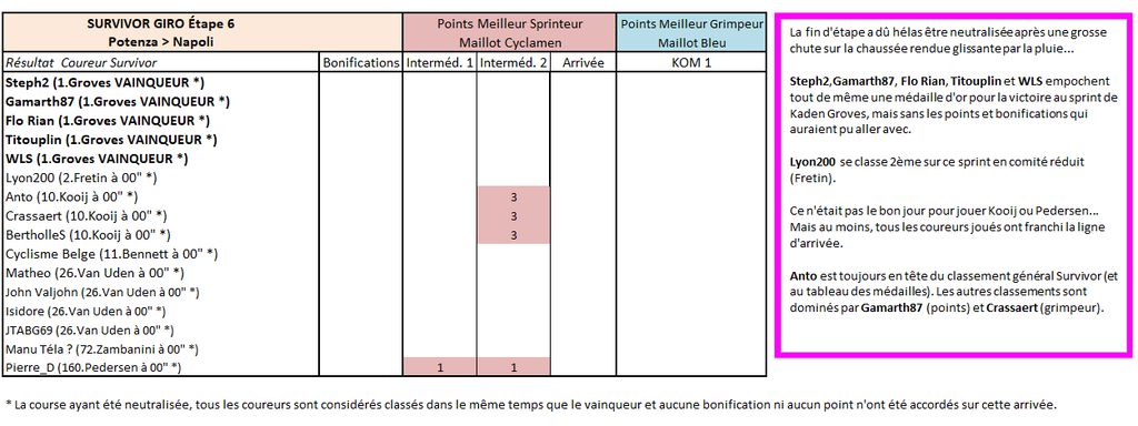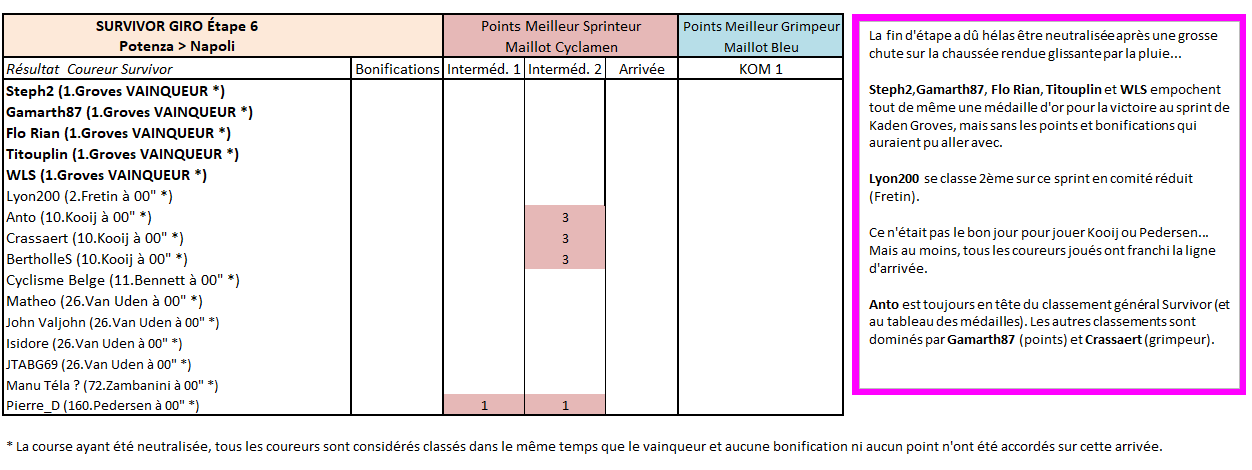 SURVIVOR GIRO La fin d'étape a dû hélas être neutralisée après une grosse chute sur la chaussée rendue glissante par la pluie... Steph2,Gamarth87, Flo Rian, Titouplin et WLS empochent tout de même une médaille d'or pour la victoire au sprint de Kaden Groves, mais sans les points et bonifications qui auraient pu aller avec. Lyon200 se classe 2ème sur ce sprint en comité réduit (Fretin). Ce n'était pas le bon jour pour jouer Kooij ou Pedersen... Mais au moins, tous les coureurs joués ont franchi la ligne d'arrivée. Anto est toujours en tête du classement général Survivor (et au tableau des médailles). Les autres classements sont dominés par Gamarth87 (points) et Crassaert (grimpeur).