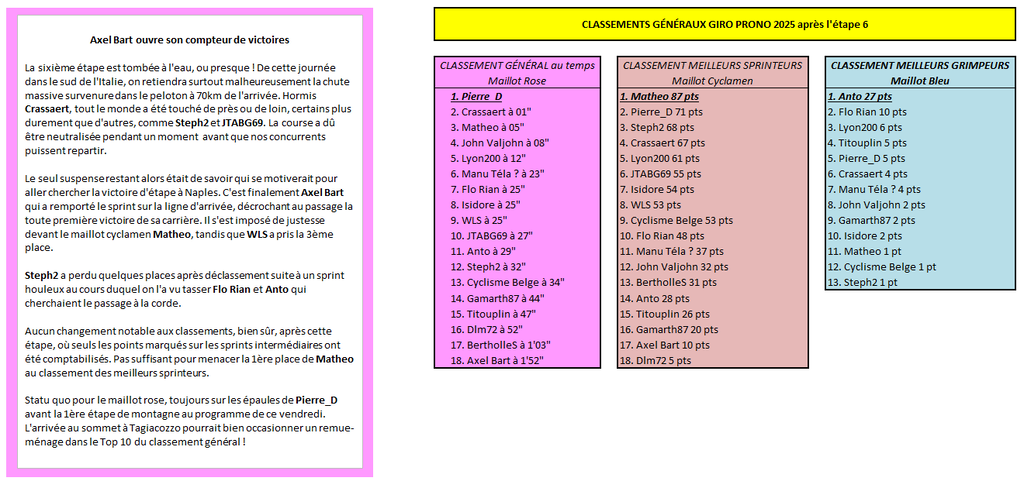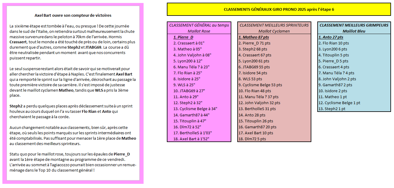 GIRO PRONO Axel Bart ouvre son compteur de victoires La sixième étape est tombée à l'eau, ou presque ! De cette journée dans le sud de l'Italie, on retiendra surtout malheureusement la chute massive survenure dans le peloton à 70km de l'arrivée. Hormis Crassaert, tout le monde a été touché de près ou de loin, certains plus durement que d'autres, comme Steph2 et JTABG69. La course a dû être neutralisée pendant un moment avant que nos concurrents puissent repartir. Le seul suspense restant alors était de savoir qui se motiverait pour aller chercher la victoire d'étape à Naples. C'est finalement Axel Bart qui a remporté le sprint sur la ligne d'arrivée, décrochant au passage la toute première victoire de sa carrière. Il s'est imposé de justesse devant le maillot cyclamen Matheo, tandis que WLS a pris la 3ème place. Steph2 a perdu quelques places après déclassement suite à un sprint houleux au cours duquel on l'a vu tasser Flo Rian et Anto qui cherchaient le passage à la corde. Aucun changement notable aux classements, bien sûr, après cette étape, où seuls les points marqués sur les sprints intermédiaires ont été comptabilisés. Pas suffisant pour menacer la 1ère place de Matheo au classement des meilleurs sprinteurs. Statu quo pour le maillot rose, toujours sur les épaules de Pierre_D avant la 1ère étape de montagne au programme de ce vendredi. L'arrivée au sommet à Tagiacozzo pourrait bien occasionner un remue-ménage dans le Top 10 du classement général !