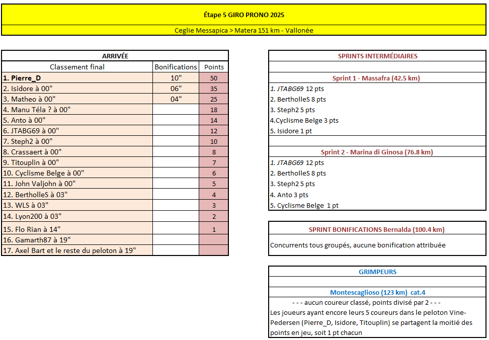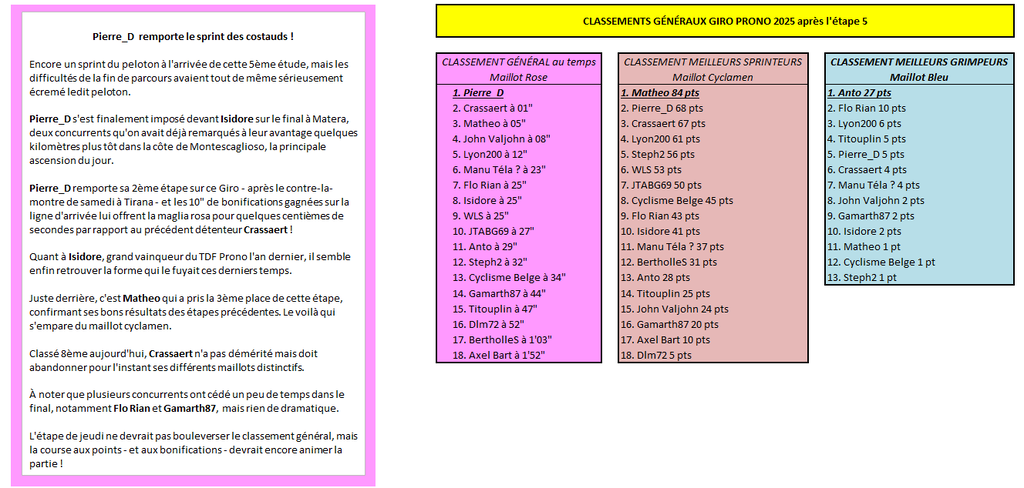 GIRO PRONO Pierre_D remporte le sprint des costauds ! Encore un sprint du peloton à l'arrivée de cette 5ème étude, mais les difficultés de la fin de parcours avaient tout de même sérieusement écremé ledit peloton. Pierre_D s'est finalement imposé devant Isidore sur le final à Matera, deux concurrents qu'on avait déjà remarqués à leur avantage quelques kilomètres plus tôt dans la côte de Montescaglioso, la principale ascension du jour. Pierre_D remporte sa 2ème étape sur ce Giro - après le contre-la-montre de samedi à Tirana - et les 10" de bonifications gagnées sur la ligne d'arrivée lui offrent la maglia rosa pour quelques centièmes de secondes par rapport au précédent détenteur Crassaert ! Quant à Isidore, grand vainqueur du TDF Prono l'an dernier, il semble enfin retrouver la forme qui le fuyait ces derniers temps. Juste derrière, c'est Matheo qui a pris la 3ème place de cette étape, confirmant ses bons résultats des étapes précédentes. Le voilà qui s'empare du maillot cyclamen. Classé 8ème aujourd'hui, Crassaert n'a pas démérité mais doit abandonner pour l'instant ses différents maillots distinctifs. À noter que plusieurs concurrents ont cédé un peu de temps dans le final, notamment Flo Rian et Gamarth87, mais rien de dramatique. L'étape de jeudi ne devrait pas bouleverser le classement général, mais la course aux points - et aux bonifications - devrait encore animer la partie !