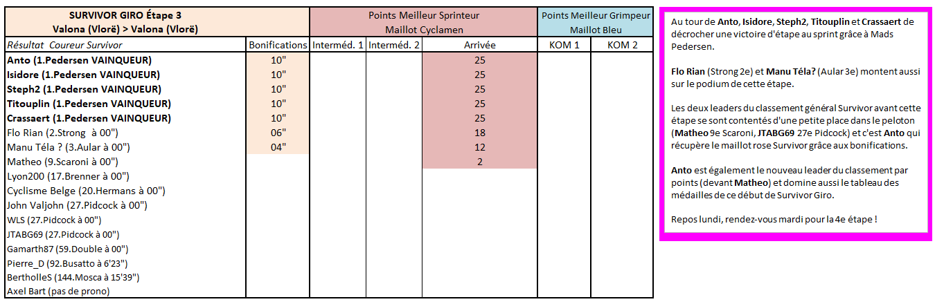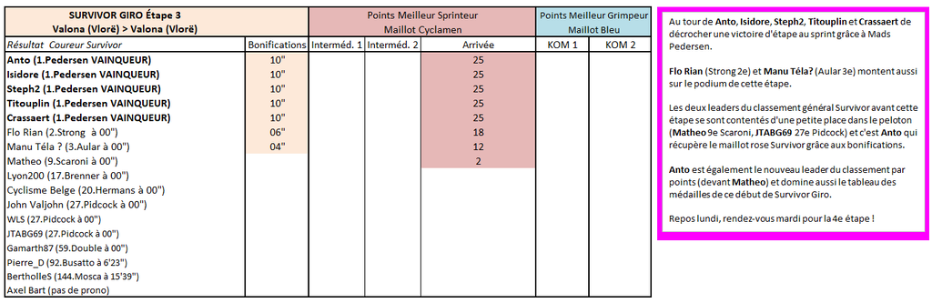 SURVIVOR GIRO Au tour de Anto, Isidore, Steph2, Titouplin et Crassaert de décrocher une victoire d'étape au sprint grâce à Mads Pedersen. Flo Rian (Strong 2e) et Manu Téla? (Aular 3e) montent aussi sur le podium de cette étape. Les deux leaders du classement général Survivor avant cette étape se sont contentés d'une petite place dans le peloton (Matheo 9e Scaroni, JTABG69 27e Pidcock) et c'est Anto qui récupère le maillot rose Survivor grâce aux bonifications. Anto est également le nouveau leader du classement par points (devant Matheo) et domine aussi le tableau des médailles de ce début de Survivor Giro. Repos lundi, rendez-vous mardi pour la 4e étape !