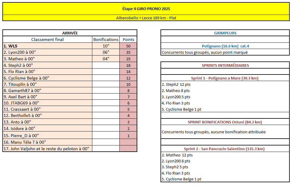 Giro Prono 2025 - Étape 4 : Alberobella > Lecce 189 km - Plat - D+730m Départ de l'étape : mardi 13/05 à 13h05 --- Coureur n°1 : Coureur n°2 : Coureur n°3 : Coureur n°4 : Coureur n°5 : --- Survivor Étape 4 : --- Top coureurs avant cette étape du Giro Prono : Les principaux favoris pour le classement général final : Ayuso, Bernal, Carapaz, Gee, Pidcock, Roglic, Storer, Tiberi, Yates A., Yates S. (N.B. : si un top coureur termine cette étape avec un écart par rapport au peloton, le temps gagné - ou perdu - par ce coureur sera affecté d'un coefficient plus important que pour un coureur lambda) ----------- Pour le jeu Survivor, il faut jouer un coureur différent à chaque étape (attention, à ce jeu vous ne pouvez choisir ce coureur qu'une seule fois, vous ne pourrez pas le réutiliser jusqu'à la fin du Survivor Giro). Vous pouvez reprendre l'un des 5 coureurs que vous avez désignés pour cette étape du Giro Prono ou choisir n'importe quel autre coureur engagé. À la fin de l'étape, vous serez directement crédité du temps réalisé par le coureur que vous avez choisi sur cette étape. ----------- -------------------------------------------------------------------- Vos coureurs interdits au jeu Survivor (coureurs déjà joués sur les étapes précédentes) Anto : 1-Van Aert : 2-Tarling : 3-Pedersen Axel Bart : 1-Vacek : 2- : 3- BertholleS : 1-Fretin : 2-Tarling : 3-Mosca Crassaert : 1-Ciccone : 2-Tarling : 3-Pedersen Cyclisme Belge : 1-Groves : 2-Vacek : 3- Flo Rian : 1-Kooij : 2-Tarling : 3-Strong Gamarth87 : 1-Strong : 2-Tarling : 3-Double Isidore : 1-Magnier : 2-Affini : 3-Pedersen John Valjohn : 1-Scaroni : 2-Tarling : 3-Pidcock JTABG69 : 1-Pedersen : 2-Tarling : 3-Pidcock Lyon200 : 1-Pedersen : 2-Roglic : 3-Brenner Manu Téla ? : 1-Strong : 2-McNulty : 3-Aular Matheo : 1-Pedersen : 2-Tarling : 3-Scaroni Pierre_D : 1-Pidcock : 2-Tarling : 3-Busatto Steph2 : 1-Kooij : 2-Tarling : 3-Pedersen Titouplin : 1-Strong : 2-Vacek : 3-Pedersen WLS : 1-Oldani : 2-Cattaneo : 3-Pidcock