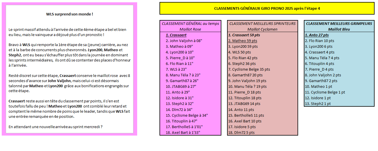 GIRO PRONO WLS surprend son monde ! Le sprint massif attendu à l'arrivée de cette 4ème étape a bel et bien eu lieu, mais le vainqueur a déjoué plus d'un pronostic ! Bravo à WLS qui remporte la 1ère étape de sa (jeune) carrière, au nez et à la barbe de concurrents plus chevronnés. Lyon200, Matheo et Steph2, ont eu beau s'échauffer plus tôt dans la journée en dominant les sprints intermédiaires, ils ont dû se contenter des places d'honneur à l'arrivée. Resté discret sur cette étape, Crassaert conserve le maillot rose avec 8 secondes d'avance sur John Valjohn, mais celui-ci est désormais talonné par Matheo et Lyon200 grâce aux bonifications engrangés sur cette étape. Crassaert reste aussi en tête du classement par points, il s'en est toutefois fallu de peu ! Matheo et Lyon200 ont comblé leur retard et comptent le même nombre de poins que le leader, tandis que WLS fait une entrée remarquée en 4e position. En attendant une nouvelle arrivée au sprint mercredi ?