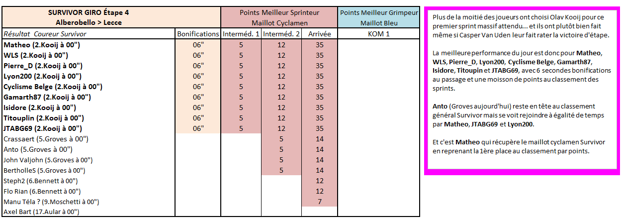 SURVIVOR GIRO Plus de la moitié des joueurs ont choisi Olav Kooij pour ce premier sprint massif attendu... et ils ont plutôt bien fait même si Casper Van Uden leur fait rater la victoire d'étape. La meilleure performance du jour est donc pour Matheo, WLS, Pierre_D, Lyon200, Cyclisme Belge, Gamarth87, Isidore, Titouplin et JTABG69, avec 6 secondes bonifications au passage et une moisson de points au classement des sprints. Anto (Groves aujourd'hui) reste en tête au classement général Survivor mais se voit rejoindre à égalité de temps par Matheo, JTABG69 et Lyon200. Et c'est Matheo qui récupère le maillot cyclamen Survivor en reprenant la 1ère place au classement par points.