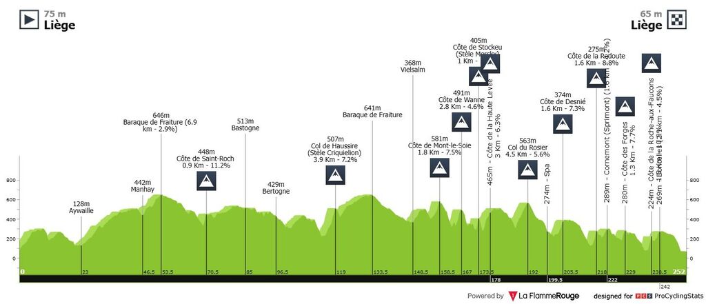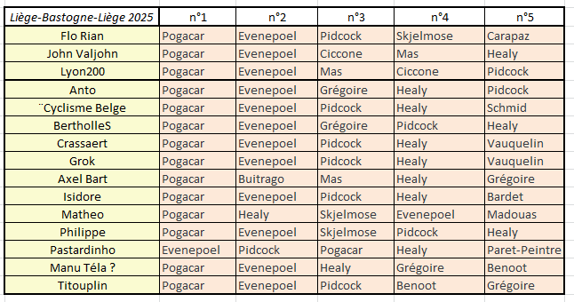 Envoyez votre prono ! ----------- Coureur n°1 : Coureur n°2 : Coureur n°3 : Coureur n°4 : Coureur n°5 : ----------- Liège - Bastogne - Liège 2025 dimanche 27 avril 2025 Liège > Liège, 252 km - D+ 4365m Départ de la course à 10h15 ----------------- ----------------- liste provisoire des coureurs engagés : https://www.procyclingstats.com/race/liege-bastogne-liege/2025/startlist/startlist ----------------- Ce sera la 3ème édition du Liège - Bastogne - Liège Prono ! Qui inscrira son nom au palmarès cette année, après Pastardinho (2023) et Yugoslaviafans (2024) ? Tout le monde peut participer ! Règlement identique à celui des précédentes courses. Pour mémoire : CLASSEMENT SUR LA LIGNE D'ARRIVÉE Sur la ligne d'arrivée de la course vous serez classés en fonction du classement du coureur le mieux placé à l'arrivée parmi les coureurs que vous avez choisis, en comparant votre prono avec ceux des autres joueurs participants. À l'arrivée de la course, on regarde qui a joué le coureur qui vient de remporter la course (si quelqu'un l'a joué). - les joueurs qui ont pronostiqué le vainqueur de la course en n°1 sont classés devant, puis ceux qui l'ont joué en n°2, puis ceux qui l'ont joué en n°3, puis ceux qui l'ont joué en n°4, puis ceux qui l'ont joué en n°5. Ceux qui ne l'ont pas joué du tout arrivent après, en donnant la priorité à ceux d'entre eux qui ont trouvé le coureur classé 2ème de la course (joué n°1 > joué n°2 > joué n°3, etc.), puis à ceux qui n'ont trouvé que le 3ème, etc. - les joueurs à égalité (par exemple si plusieurs joueurs ont joué n°1 le coureur concerné) sont départagés en fonction de leur 2ème coureur le mieux classé à l'arrivée, en suivant toujours la même règle : coureur joué en n°1 > n°2 > n°3 > n°4 > n°5. - Au besoin, si la prise en compte du deuxième meilleur coureur ne suffit pas, les joueurs exæquo sont départagés en fonction de leur 3ème meilleur coureur, et de sa position dans leur prono, ou si cela ne suffit toujours pas, on prend en compte leur 4ème coureur, puis, si nécessaire, le 5ème pour la photo-finish. En dernier recours, si plusieurs joueurs ont joué exactement les mêmes coureurs dans le même ordre, c'est celui qui aura communiqué ses ordres le plus tôt qui sera classé premier. Accessoirement, on affinera le classement en calculant les écarts 'au temps', en appliquant les mêmes barèmes que pour une étape du TDF Prono.