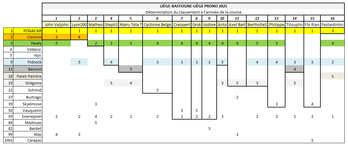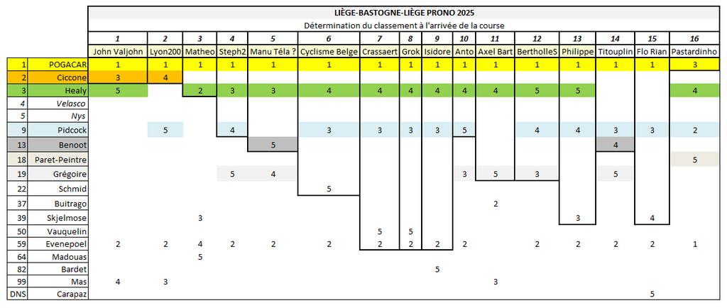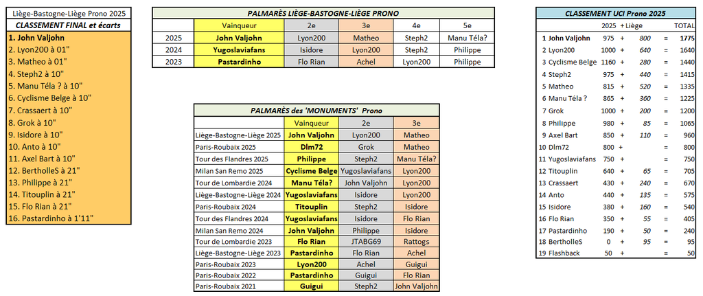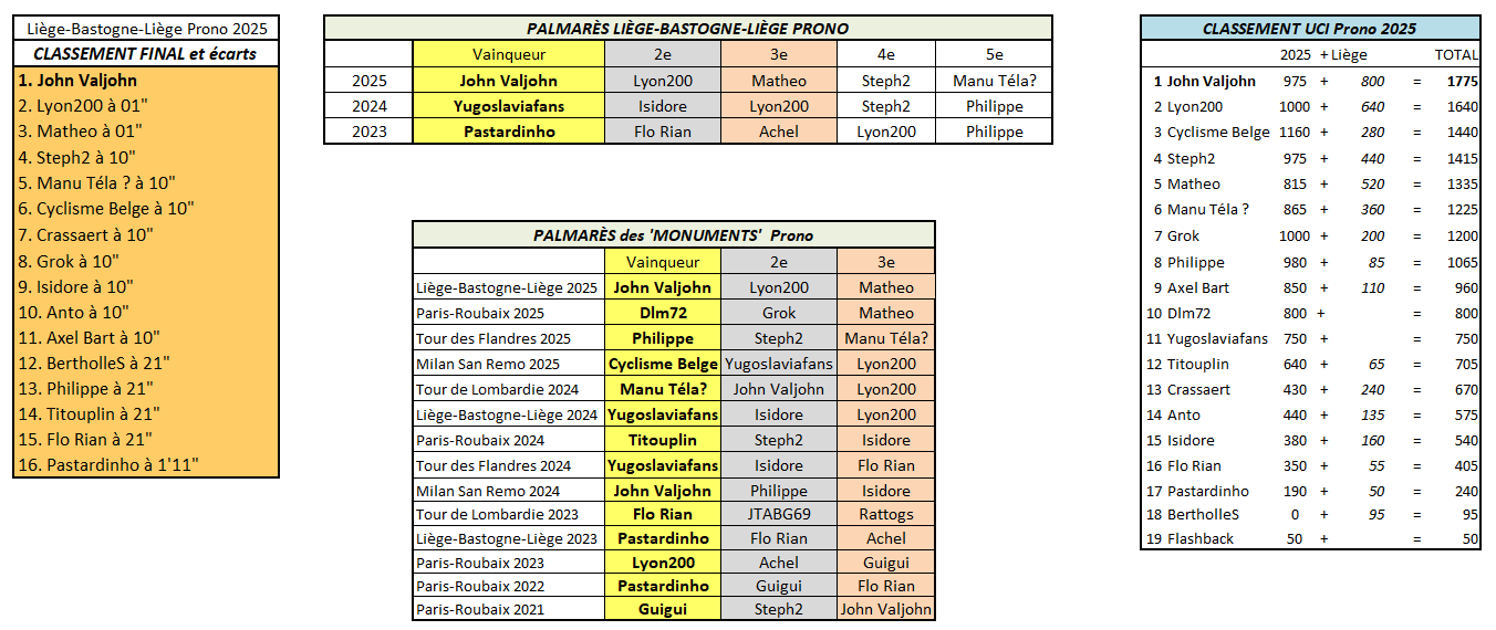Classement Liège-Bastogne-Liège Prono 2025 1. John Valjohn 2. Lyon200 à 01" 3. Matheo à 01" 4. Steph2 à 10" 5. Manu Téla ? à 10" 6. ¨Cyclisme Belge à 10" 7. Crassaert à 10" 8. Grok à 10" 9. Isidore à 10" 10. Anto à 10" 11. Axel Bart à 10" 12. BertholleS à 20" 13. Philippe à 20" 14. Titouplin à 21" 15. Flo Rian à 21" 16. Pastardinho à 1'11"