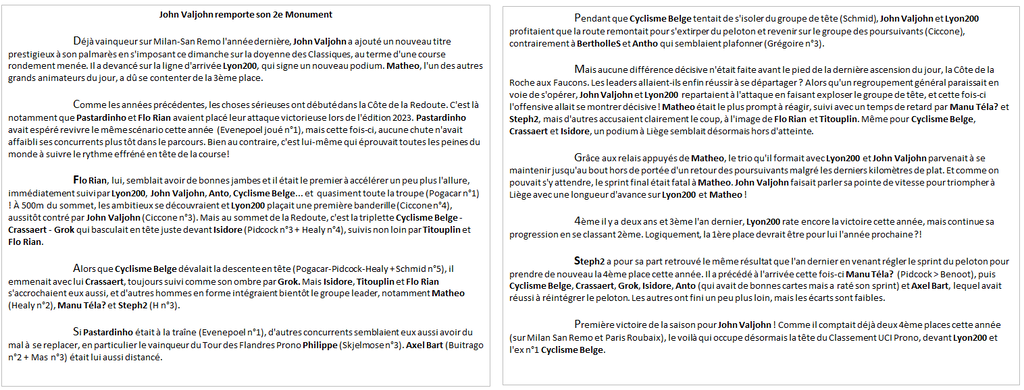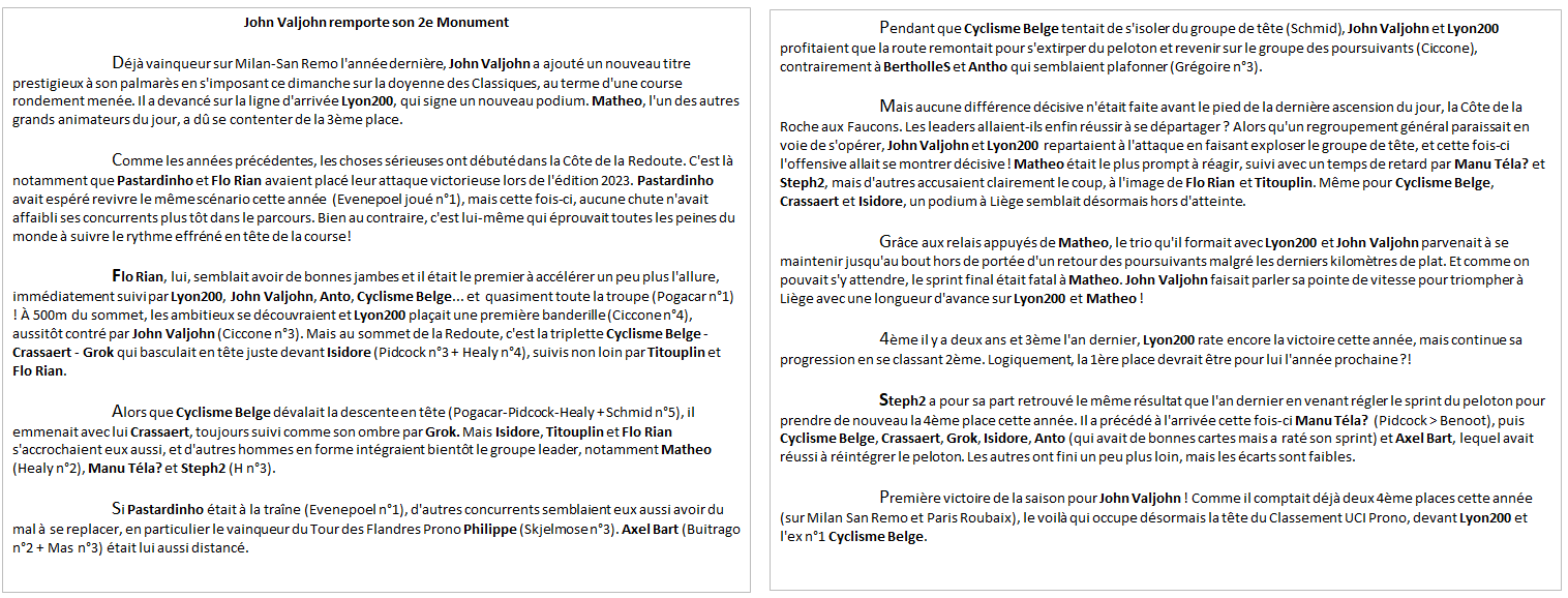 John Valjohn remporte son 2e Monument Déjà vainqueur sur Milan-San Remo l'année dernière, John Valjohn a ajouté un nouveau titre prestigieux à son palmarès en s'imposant ce dimanche sur la doyenne des Classiques, au terme d'une course rondement menée. Il a devancé sur la ligne d'arrivée Lyon200, qui signe un nouveau podium. Matheo, l'un des autres grands animateurs du jour, a dû se contenter de la 3ème place. Comme les années précédentes, les choses sérieuses ont débuté dans la Côte de la Redoute. C'est là notamment que Pastardinho et Flo Rian avaient placé leur attaque victorieuse lors de l'édition 2023. Pastardinho avait espéré revivre le même scénario cette année (Evenepoel joué n°1), mais cette fois-ci, aucune chute n'avait affaibli ses concurrents plus tôt dans le parcours. Bien au contraire, c'est lui-même qui éprouvait toutes les peines du monde à suivre le rythme effréné en tête de la course! Flo Rian, lui, semblait avoir de bonnes jambes et il était le premier à accélérer un peu plus l'allure, immédiatement suivi par Lyon200, John Valjohn, Anto, Cyclisme Belge... et quasiment toute la troupe (Pogacar n°1) ! À 500m du sommet, les ambitieux se découvraient et Lyon200 plaçait une première banderille (Ciccone n°4), aussitôt contré par John Valjohn (Ciccone n°3). Mais au sommet de la Redoute, c'est la triplette Cyclisme Belge - Crassaert - Grok qui basculait en tête juste devant Isidore (Pidcock n°3 + Healy n°4), suivis non loin par Titouplin et Flo Rian. Alors que Cyclisme Belge dévalait la descente en tête (Pogacar-Pidcock-Healy + Schmid n°5), il emmenait avec lui Crassaert, toujours suivi comme son ombre par Grok. Mais Isidore, Titouplin et Flo Rian s'accrochaient eux aussi, et d'autres hommes en forme intégraient bientôt le groupe leader, notamment Matheo (Healy n°2), Manu Téla? et Steph2 (H n°3). Si Pastardinho était à la traîne (Evenepoel n°1), d'autres concurrents semblaient eux aussi avoir du mal à se replacer, en particulier le vainqueur du Tour des Flandres Prono Philippe (Skjelmose n°3). Axel Bart (Buitrago n°2 + Mas n°3) était lui aussi distancé. Pendant que Cyclisme Belge tentait de s'isoler du groupe de tête (Schmid), John Valjohn et Lyon200 profitaient que la route remontait pour s'extirper du peloton et revenir sur le groupe des poursuivants (Ciccone), contrairement à BertholleS et Antho qui semblaient plafonner (Grégoire n°3). Mais aucune différence décisive n'était faite avant le pied de la dernière ascension du jour, la Côte de la Roche aux Faucons. Les leaders allaient-ils enfin réussir à se départager ? Alors qu'un regroupement général paraissait en voie de s'opérer, John Valjohn et Lyon200 repartaient à l'attaque en faisant exploser le groupe de tête, et cette fois-ci l'offensive allait se montrer décisive ! Matheo était le plus prompt à réagir, suivi avec un temps de retard par Manu Téla? et Steph2, mais d'autres accusaient clairement le coup, à l'image de Flo Rian et Titouplin. Même pour Cyclisme Belge, Crassaert et Isidore, un podium à Liège semblait désormais hors d'atteinte. Grâce aux relais appuyés de Matheo, le trio qu'il formait avec Lyon200 et John Valjohn parvenait à se maintenir jusqu'au bout hors de portée d'un retour des poursuivants malgré les derniers kilomètres de plat. Et comme on pouvait s'y attendre, le sprint final était fatal à Matheo. John Valjohn faisait parler sa pointe de vitesse pour triompher à Liège avec une longueur d'avance sur Lyon200 et Matheo ! 4ème il y a deux ans et 3ème l'an dernier, Lyon200 rate encore la victoire cette année, mais continue sa progression en se classant 2ème. Logiquement, la 1ère place devrait être pour lui l'année prochaine ?! Steph2 a pour sa part retrouvé le même résultat que l'an dernier en venant régler le sprint du peloton pour prendre de nouveau la 4ème place cette année. Il a précédé à l'arrivée cette fois-ci Manu Téla? (Pidcock > Benoot), puis Cyclisme Belge, Crassaert, Grok, Isidore, Anto (qui avait de bonnes cartes mais a raté son sprint) et Axel Bart, lequel avait réussi à réintégrer le peloton. Les autres ont fini un peu plus loin, mais les écarts sont faibles. Première victoire de la saison pour John Valjohn ! Comme il comptait déjà deux 4ème places cette année (sur Milan San Remo et Paris Roubaix), le voilà qui occupe désormais la tête du Classement UCI Prono, devant Lyon200 et l'ex n°1 Cyclisme Belge. Bravo à tous. Et pour ceux qui ont la grinta, rendez-vous bientôt sur le Giro à partir du 9 mai !