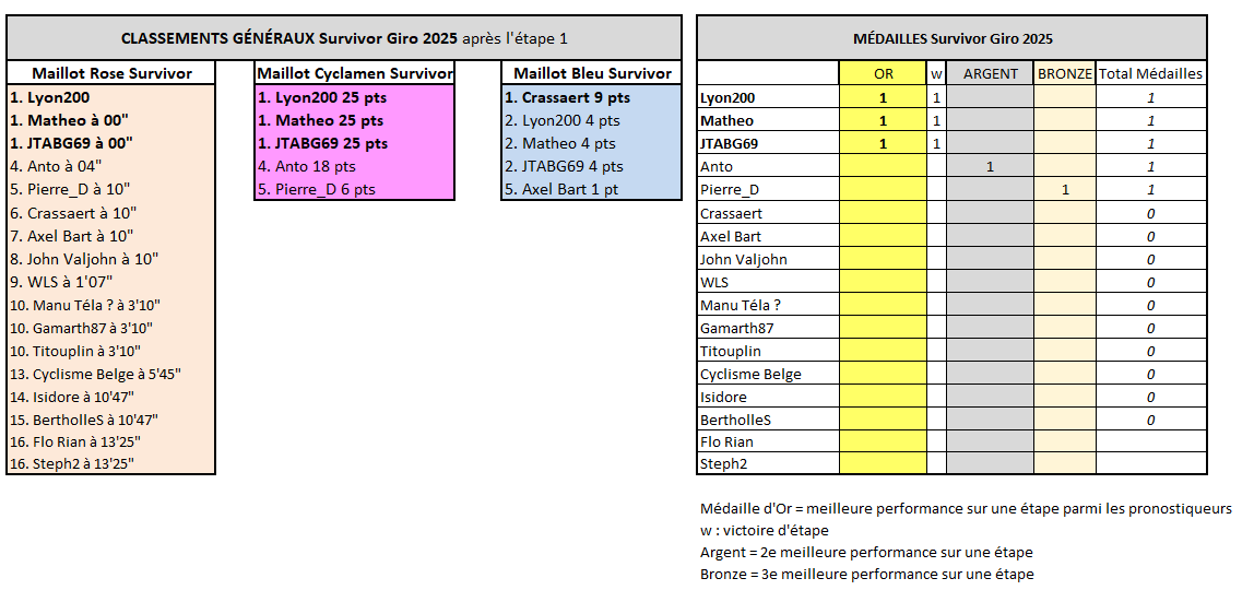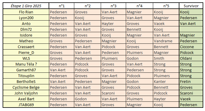 Résultats Étape 1 - Giro Prono & Survivor 2025