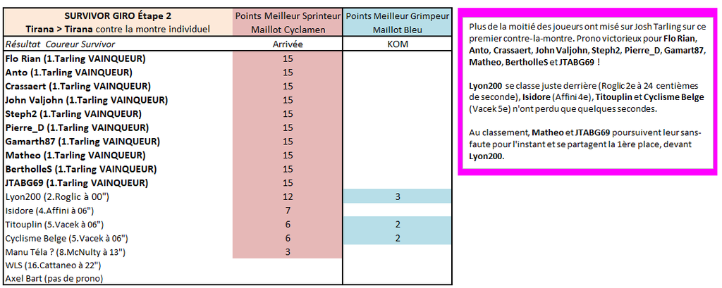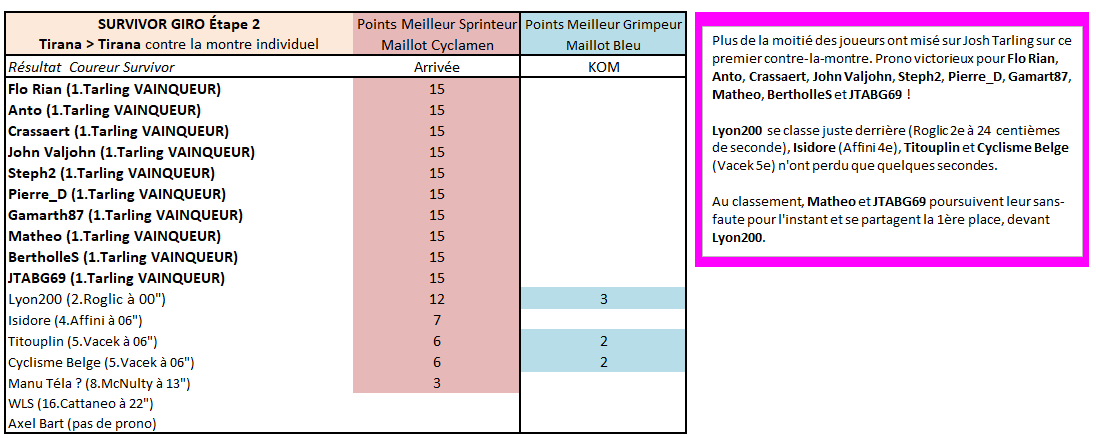 SURVIVOR GIRO Plus de la moitié des joueurs ont misé sur Josh Tarling sur ce premier contre-la-montre. Prono victorieux pour Flo Rian, Anto, Crassaert, John Valjohn, Steph2, Pierre_D, Gamart87, Matheo, BertholleS et JTABG69 ! Lyon200 se classe juste derrière (Roglic 2e à 24 centièmes de seconde), Isidore (Affini 4e), Titouplin et Cyclisme Belge (Vacek 5e) n'ont perdu que quelques secondes. Au classement, Matheo et JTABG69 poursuivent leur sans-faute pour l'instant et se partagent la 1ère place, devant Lyon200.