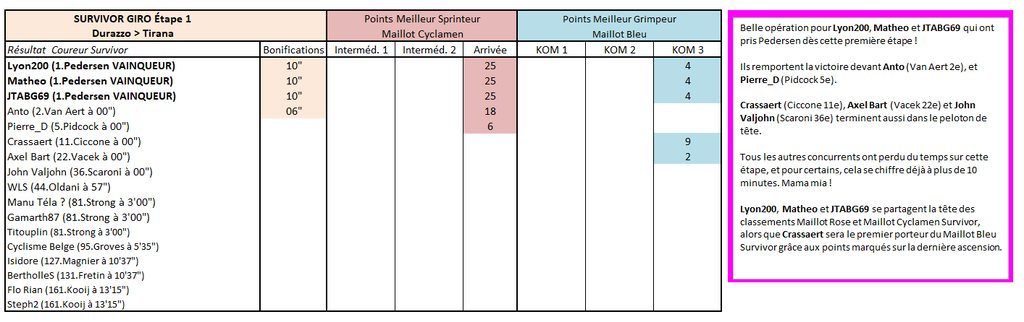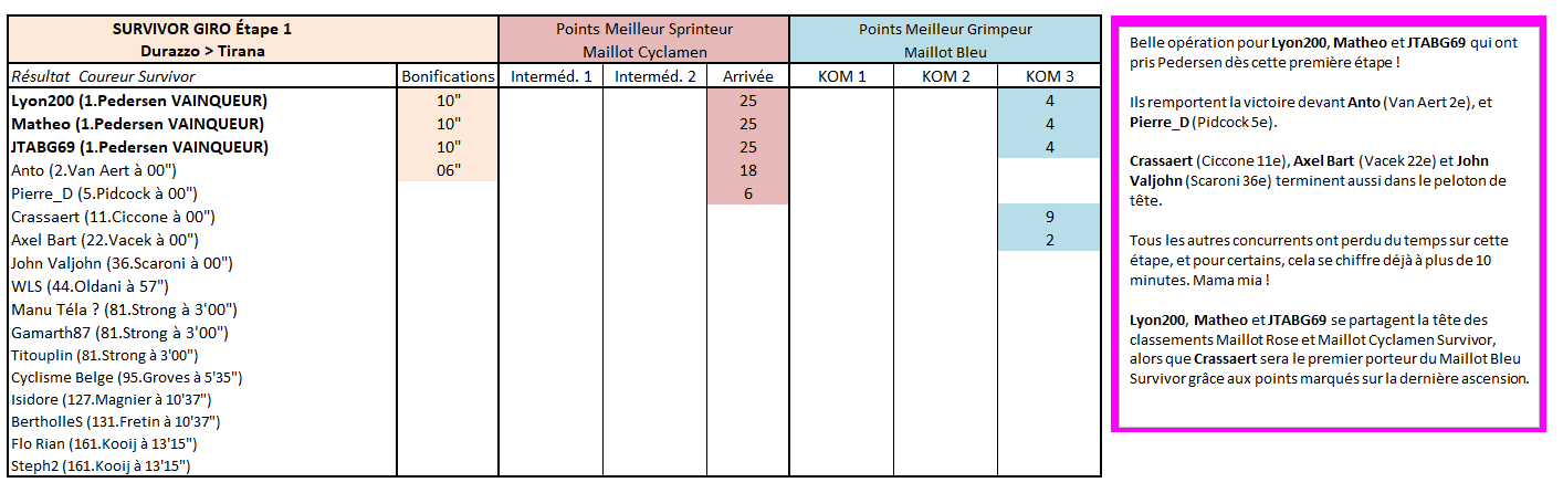 SURVIVOR GIRO Belle opération pour Lyon200, Matheo et JTABG69 qui ont pris Pedersen dès cette première étape ! Ils remportent la victoire devant Anto (Van Aert 2e), et Pierre_D (Pidcock 5e). Crassaert (Ciccone 11e), Axel Bart (Vacek 22e) et John Valjohn (Scaroni 36e) terminent aussi dans le peloton de tête. Tous les autres concurrents ont perdu du temps sur cette étape, et pour certains, cela se chiffre déjà à plus de 10 minutes. Mama mia ! Lyon200, Matheo et JTABG69 se partagent la tête des classements Maillot Rose et Maillot Cyclamen Survivor, alors que Crassaert sera le premier porteur du Maillot Bleu Survivor grâce aux points marqués sur la dernière ascension.
