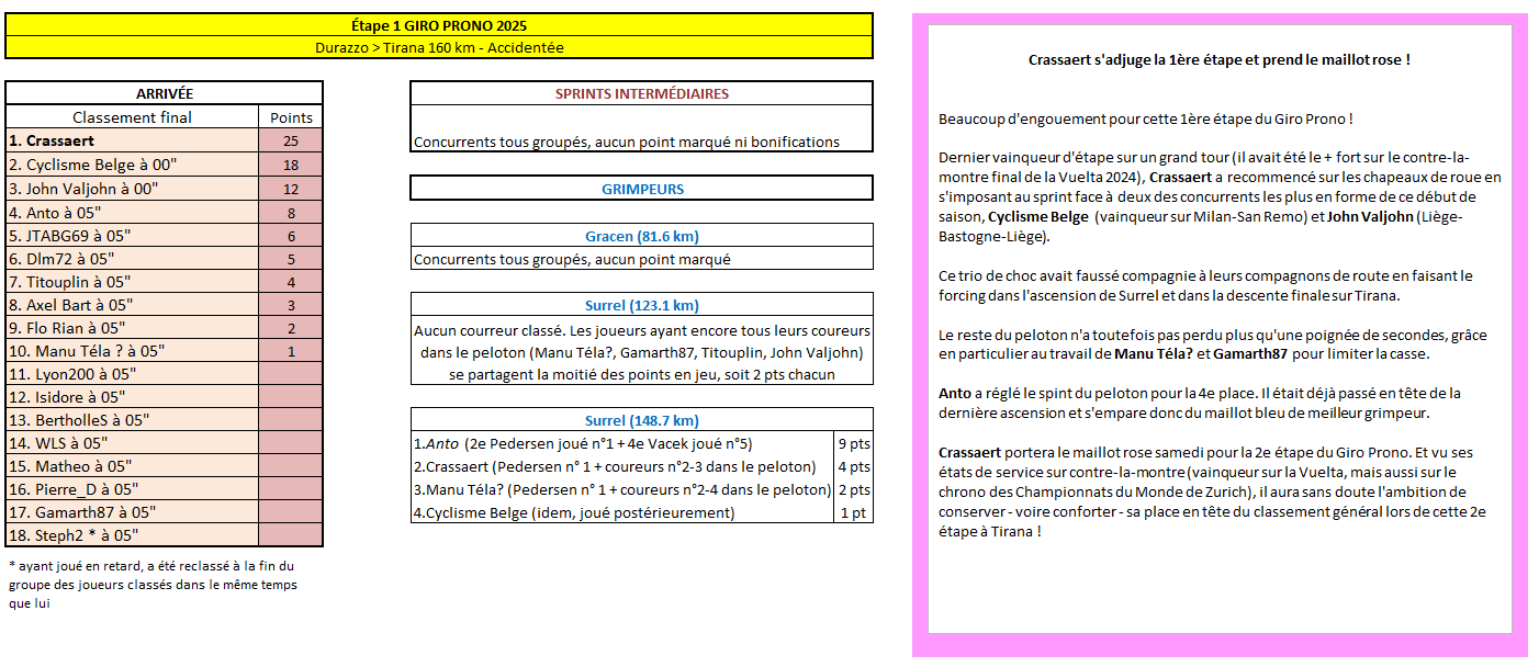 GIRO PRONO Crassaert s'adjuge la 1ère étape et prend le maillot rose ! Beaucoup d'engouement pour cette 1ère étape du Giro Prono ! Dernier vainqueur d'étape sur un grand tour (il avait été le + fort sur le contre-la-montre final de la Vuelta 2024), Crassaert a recommencé sur les chapeaux de roue en s'imposant au sprint face à deux des concurrents les plus en forme de ce début de saison, Cyclisme Belge (vainqueur sur Milan-San Remo) et John Valjohn (Liège-Bastogne-Liège). Ce trio de choc avait faussé compagnie à leurs compagnons de route en faisant le forcing dans l'ascension de Surrel et dans la descente finale sur Tirana. Le reste du peloton n'a toutefois pas perdu plus qu'une poignée de secondes, grâce en particulier au travail de Manu Téla? et Gamarth87 pour limiter la casse. Anto a réglé le spint du peloton pour la 4e place. Il était déjà passé en tête de la dernière ascension et s'empare donc du maillot bleu de meilleur grimpeur. Crassaert portera le maillot rose samedi pour la 2e étape du Giro Prono. Et vu ses états de service sur contre-la-montre (vainqueur sur la Vuelta, mais aussi sur le chrono des Championnats du Monde de Zurich), il aura sans doute l'ambition de conserver - voire conforter - sa place en tête du classement général lors de cette 2e étape à Tirana !