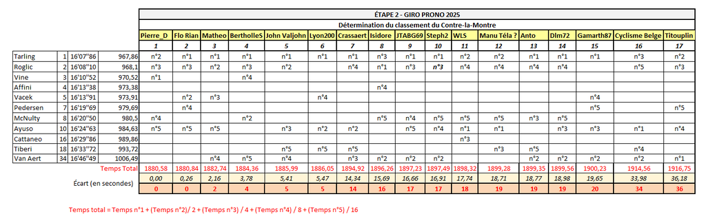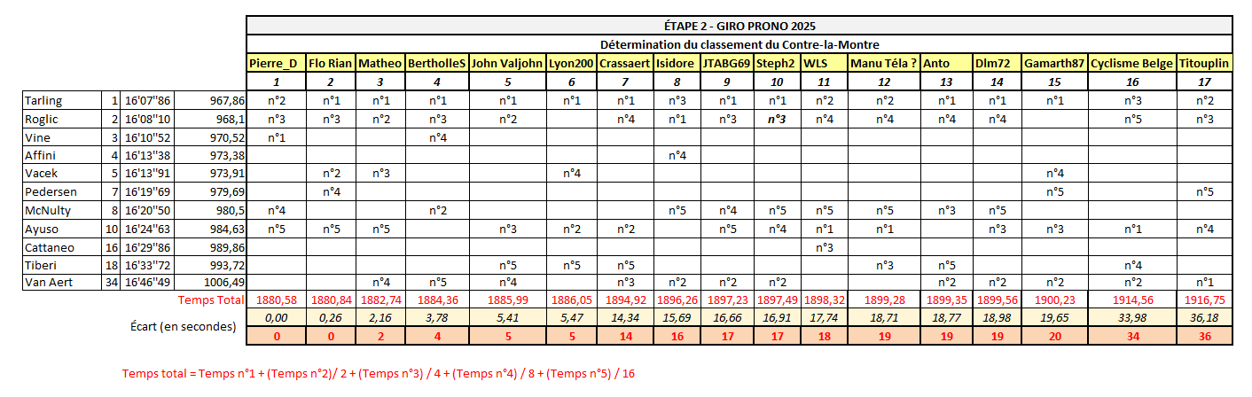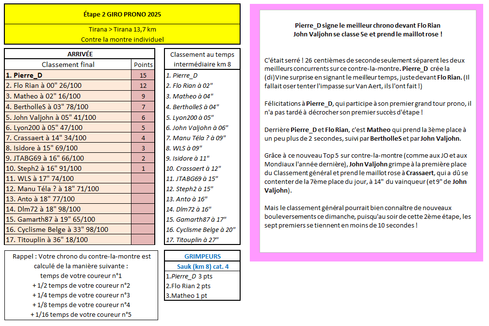 GIRO PRONO Pierre_D signe le meilleur chrono devant Flo Rian John Valjohn se classe 5e et prend le maillot rose ! C'était serré ! 26 centièmes de seconde seulement séparent les deux meilleurs concurrents sur ce contre-la-montre. Pierre_D crée la (di)Vine surprise en signant le meilleur temps, juste devant Flo Rian. (Il fallait oser tenter l'impasse sur Van Aert, ils l'ont fait !) Félicitations à Pierre_D, qui participe à son premier grand tour prono, il n'a pas tardé à décrocher son premier succès d'étape ! Derrière Pierre_D et Flo Rian, c'est Matheo qui prend la 3ème place à un peu plus de 2 secondes, suivi par BertholleS et par John Valjohn. Grâce à ce nouveau Top 5 sur contre-la-montre (comme aux JO et aux Mondiaux l'année dernière), John Valjohn grimpe à la première place du Classement général et prend le maillot rose à Crassaert, qui a dû se contenter de la 7ème place du jour, à 14" du vainqueur (et 9" de John Valjohn). Mais le classement général pourrait bien connaître de nouveaux bouleversements ce dimanche, puisqu'au soir de cette 2ème étape, les sept premiers se tiennent en moins de 10 secondes !