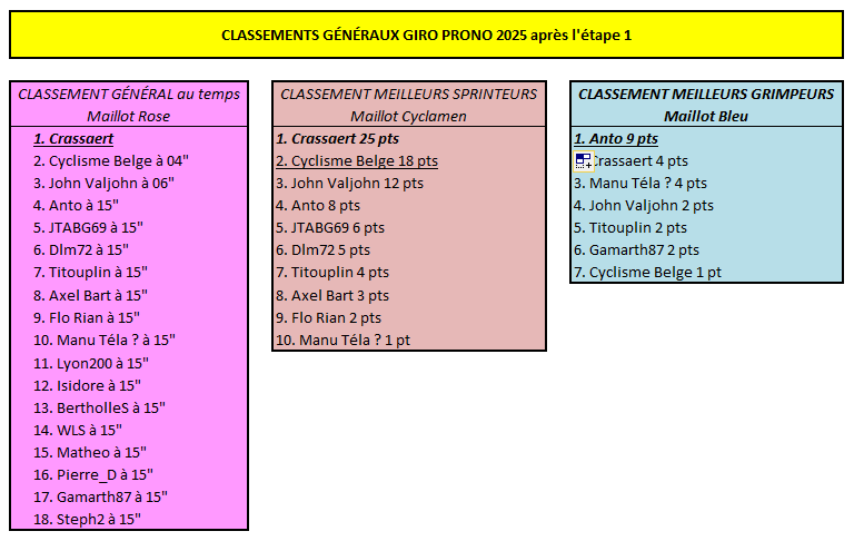 ARRIVÉE PROVISOIRE Giro Prono - Étape 1 1. Crassaert 2. Cyclisme Belge à 00" 3. John Valjohn à 00" 4. Anto à 05" 5. Dlm72 à 05" 6. JTABG69 à 05" 7. Titouplin à 05" 8. Flo Rian à 05" 9. Axel Bart à 05" 10. Manu Téla ? à 05" 11. Lyon200 à 05" 12. Isidore à 05" 13. BertholleS à 05" 14. Matheo à 05" 15. WLS à 05" 16. Pierre_D à 05" 17. Gamarth87 à 05" 18. Steph2 et le reste du peloton à 05"