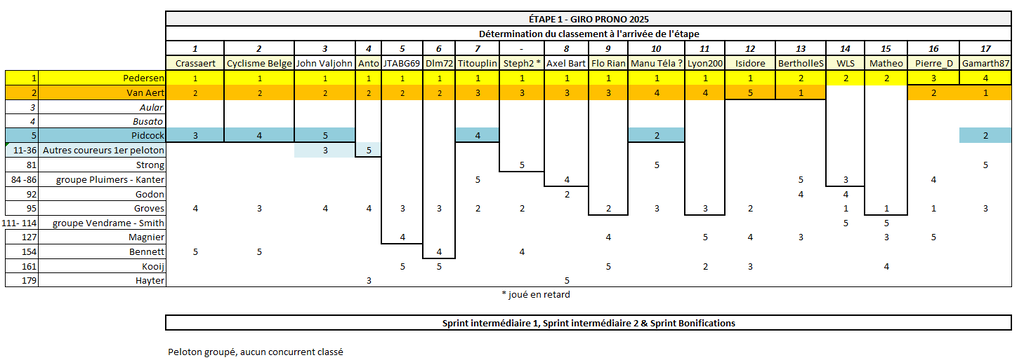Victoire de Crassaert (Pedersen n°1 + Van Aert n°2 + Pidcock n°3) devant Cyclisme Belge (" " + Pidcock n°4) et John Valjohn (" " + Pidcock n°5) ! Crassaert 1er maillot rose de ce Giro Prono !
