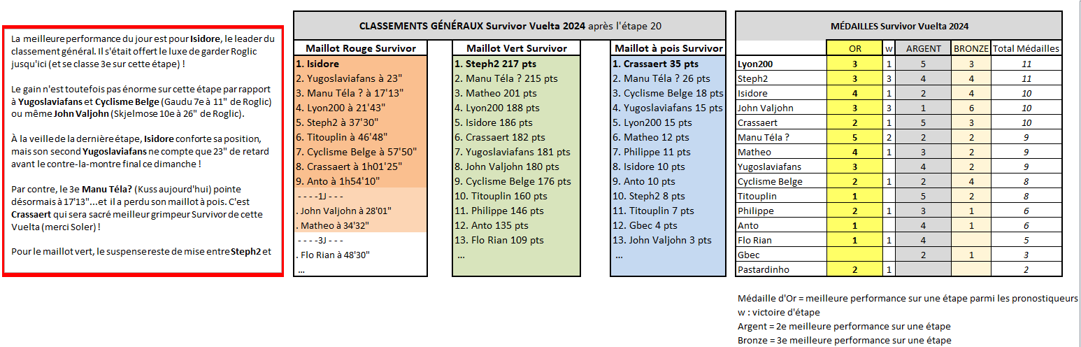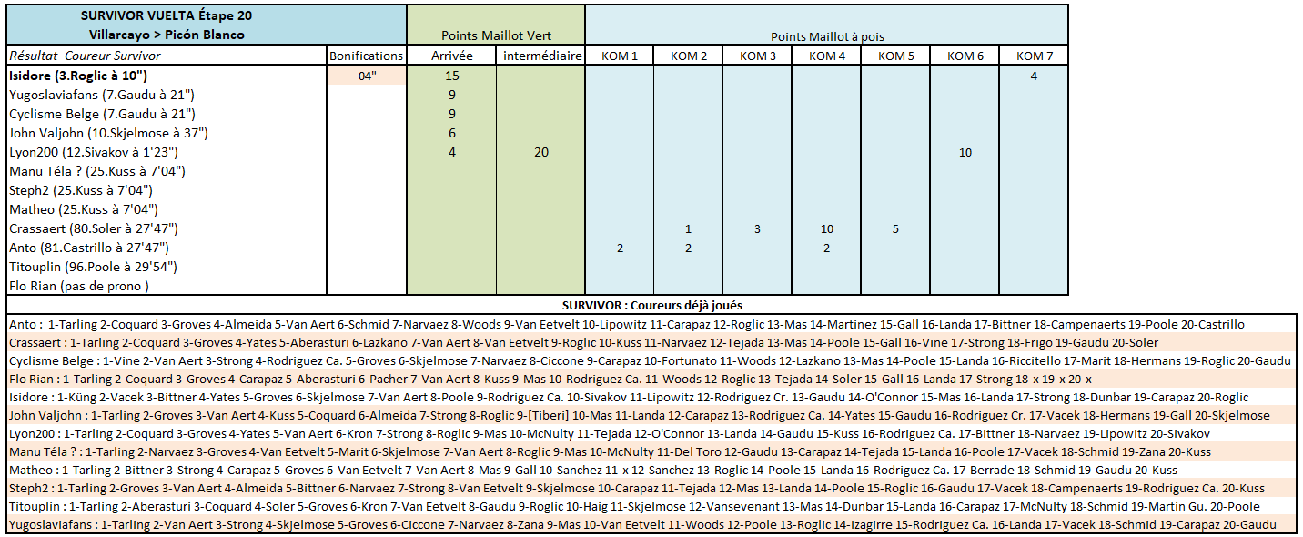 20. Au Survivor, Isidore confirme sa première place, il avait gardé Roglic pour aujourd'hui (3e) et reprend quelques secondes à Yugoslaviafans et Cyclisme Belge (Gaudu 7e). L'écart entre Isidore et Yugoslaviafans monte à 23" (seulement) avant la dernière étape demain contre-la-montre !