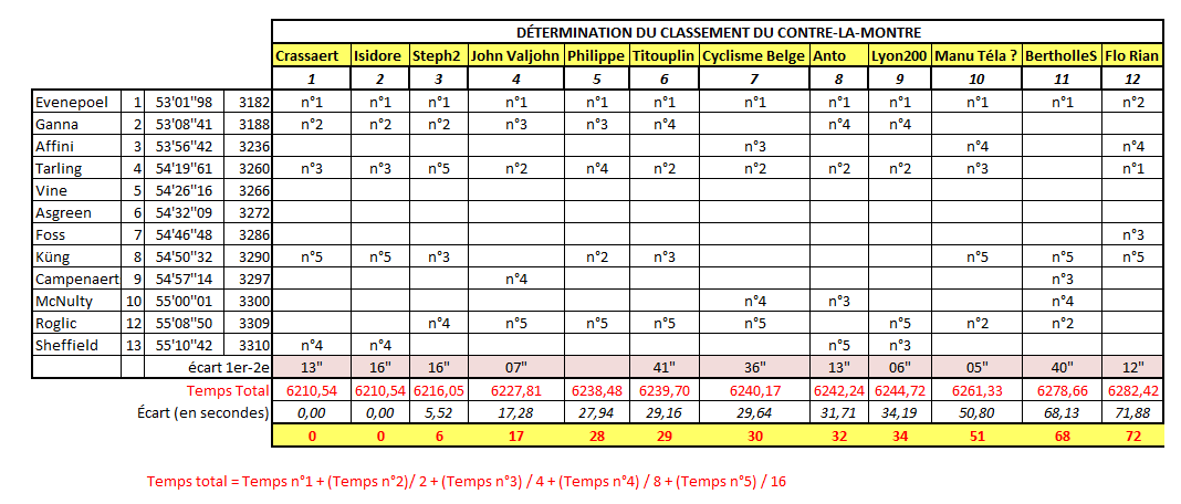 7. 3e temps intermédiaire Très serré entre les 3 premiers ! 1. Isidore 2. Crassaert à 00" 3. Steph2 à 00"43/100 4. John Valjohn à 11" 5. Philippe à 14" 6. Titouplin à 16" 7. Cyclisme Belge à 23" 8. Anto à 23" 9. Lyon200 à 24" 10. Manu Téla ? à 33" 11. BertholleS à 44" 12. Flo Rian à 1'01"