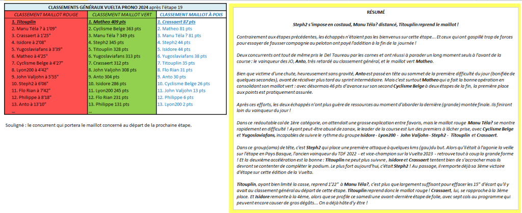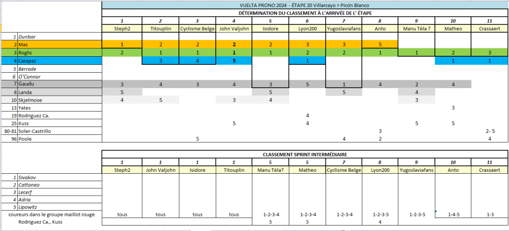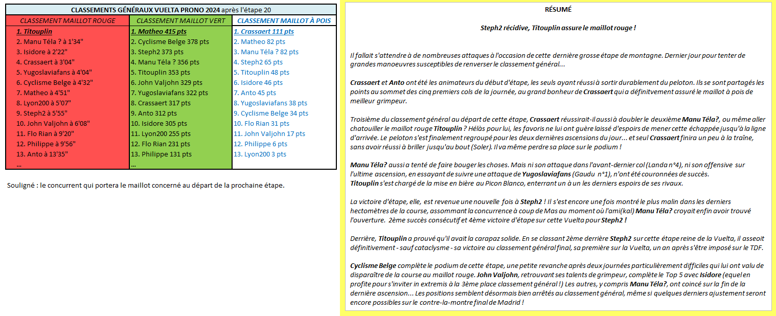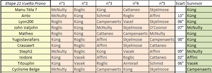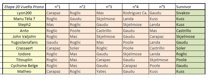 21. Steph2 récidive ! Nouvelle victoire d'étape au sommet (Mas n°1 > Roglic n°2), devant le maillot rouge Titouplin (Mas n°2 + Roglic n°1 + Carapaz n°3), Cyclisme Belge (+ Carapaz n°4) et John Valjohn (+ Carapaz n°5). Manu Téla? et Crassaert distancés aujourd'hui, Titouplin va donc remporter cette édition de la Vuelta Prono !